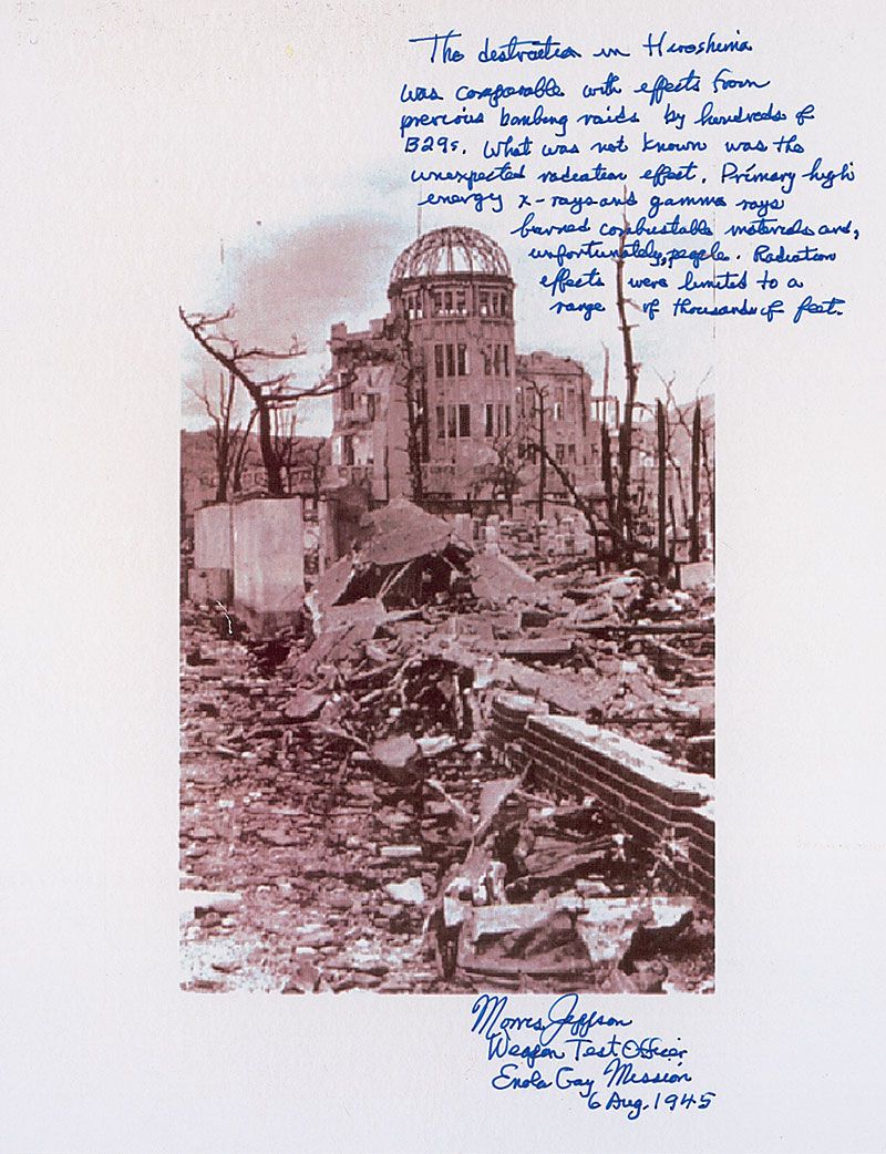 Laserprint 8.5 x 11 photo of the devastated Hiroshima, signed in blue felt tip, “The destruction in Hiroshima was comparable with effects from previous bombing raids by hundreds of B29s. What was not known was the unexpected radiation effect. Primary high energy x-rays and gamma rays burned combustible materials and, unfortunately people. Radiation effects were limited to a range of thousands of feet. Morris Jeppson, Weapons Test Officer, Enola Gay Mission, 6 Aug 1945.” In fine condition.