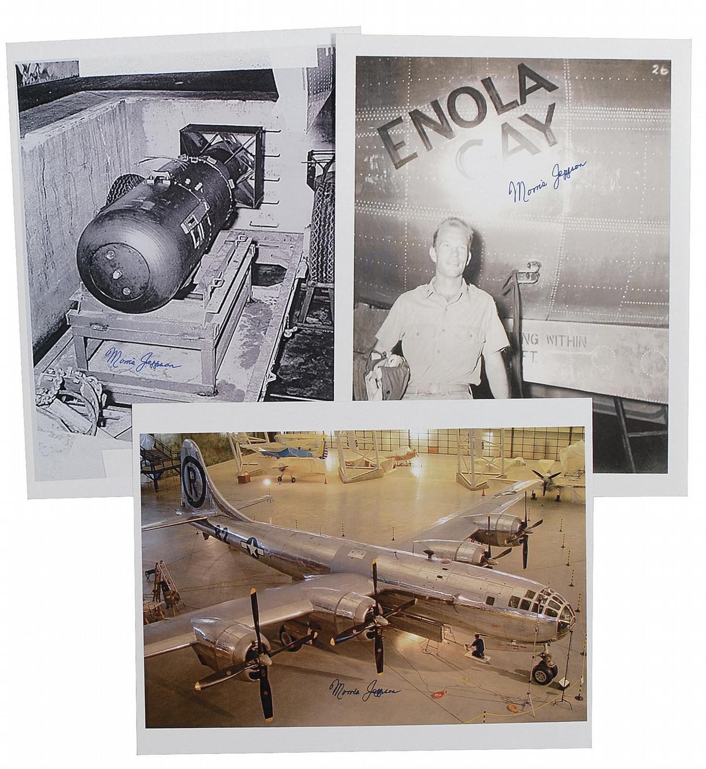 Three items: two 8.5 x 11 laser print photos, one in uniform and one of the atomic bomb, and an 11 x 8.5 laser print photo of the Enola Gay in a hanger, each signed in blue felt tip by Morris Jeppson. In overall fine condition.