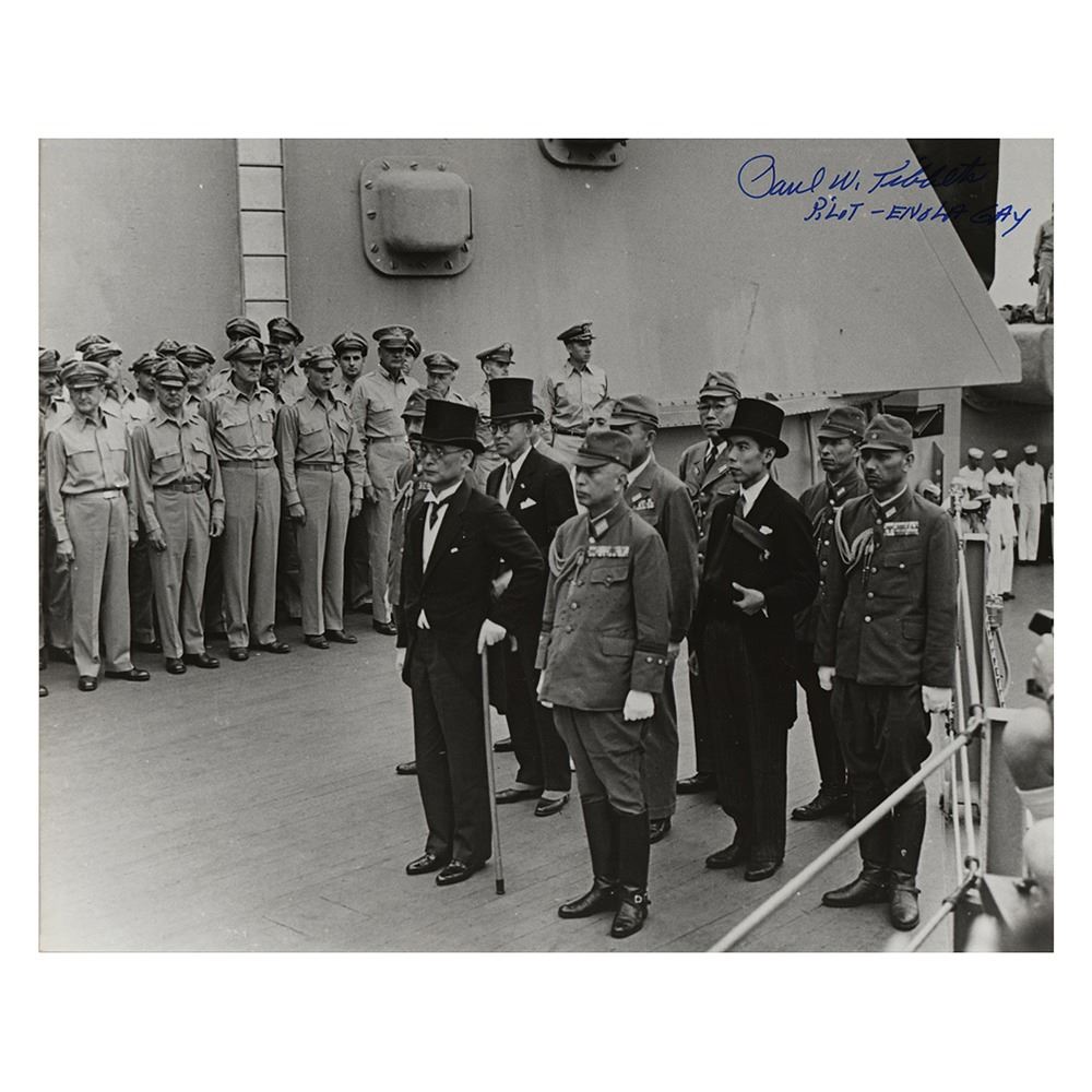 Satin-finish 10 x 8 photo of US military officers observing the arrival of the Japanese delegation for the signing of the Instrument of Surrender aboard the USS Missouri on September 2, 1945, signed in blue felt tip, "Paul W. Tibbets, Pilot—Enola Gay." In very fine condition.