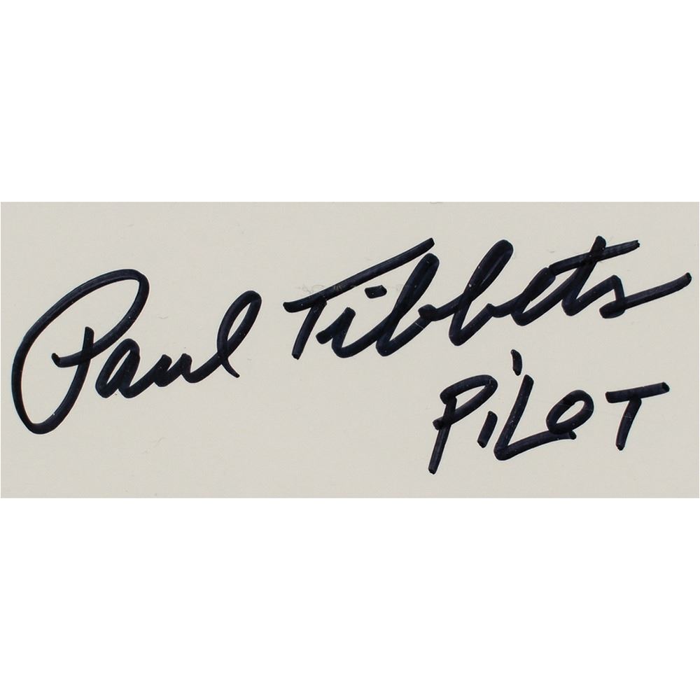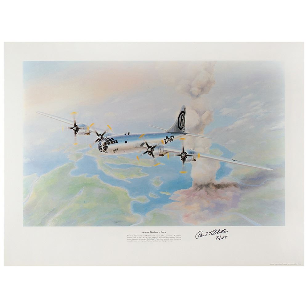 Color 24 x 18 print of a Harley Copic painting entitled ‘Atomic Warfare Is Born,’ which shows the Enola Gay flying over Japan, with a large pillar of smoke rising up from the city of Hiroshima, signed in the lower border in black felt tip, "Paul Tibbets, Pilot." In fine condition, with some scattered creases.