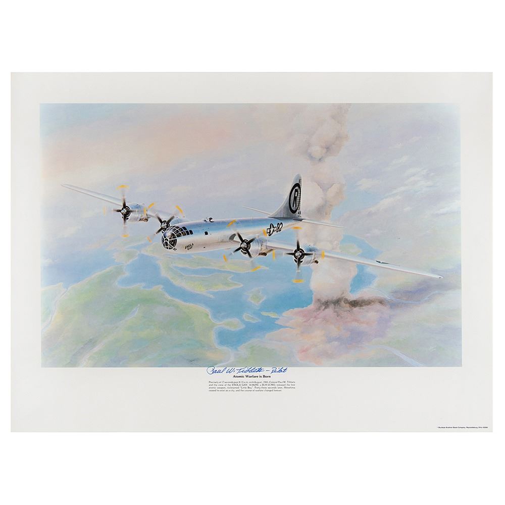 Color 24 x 18 print of a Harley Copic painting entitled 'Atomic Warfare Is Born,' which shows the Enola Gay flying over Japan, with a large pillar of smoke rising up from the city of Hiroshima, signed in the lower border in blue felt tip, "Paul W. Tibbets-Pilot." Rolled and in fine condition.