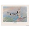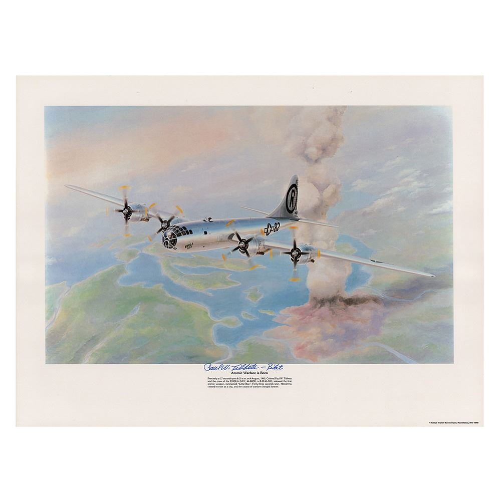Color 24 x 18 print of a Harley Copic painting entitled ‘Atomic Warfare Is Born,’ which shows the Enola Gay flying over Japan, with a large pillar of smoke rising up from the city of Hiroshima, signed in the lower border in blue felt tip, “Paul W. Tibbets—Pilot." Rolled and in fine condition.