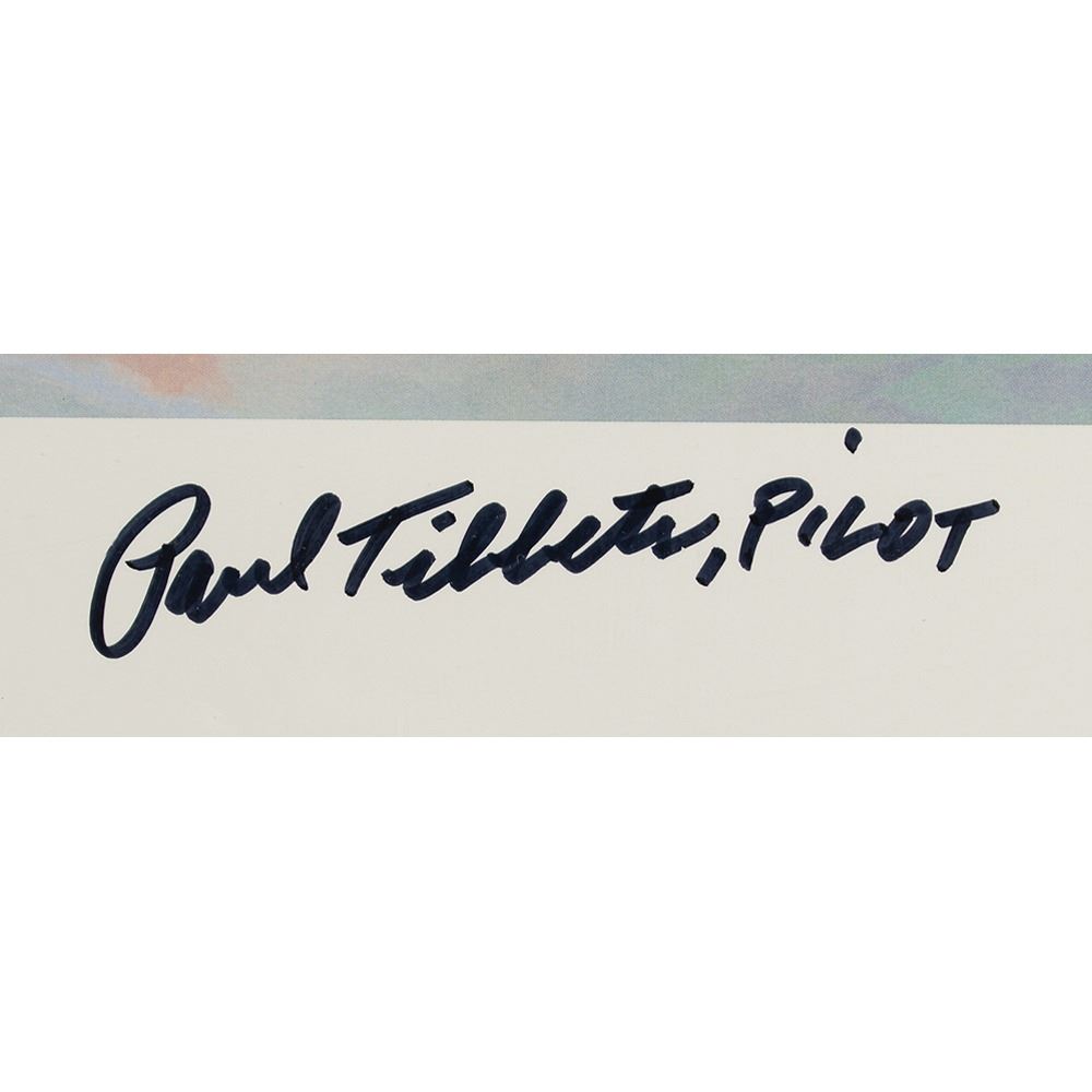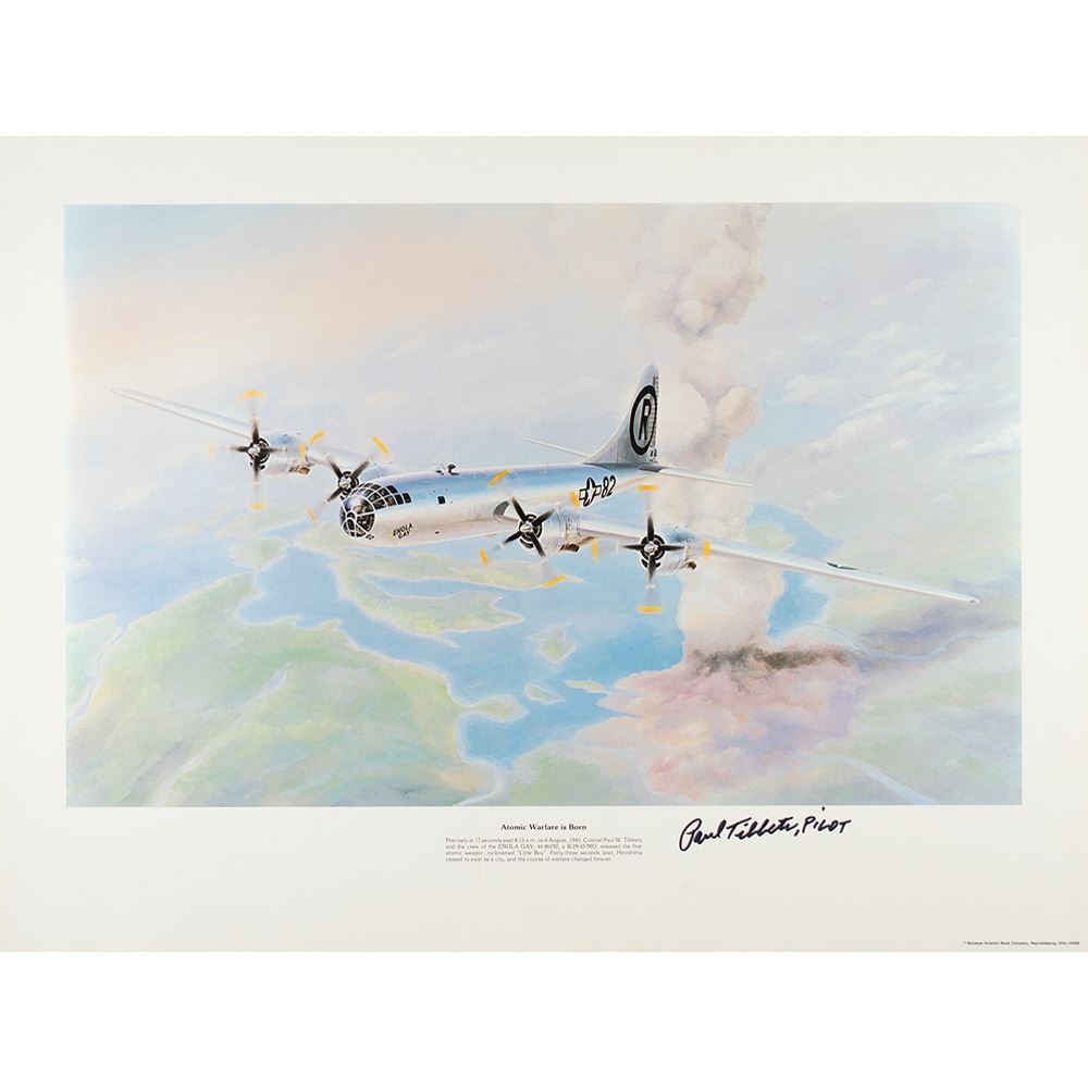 Color 24 x 18 print of a Harley Copic painting entitled 'Atomic Warfare Is Born,' which shows the Enola Gay flying over Japan, with a large pillar of smoke rising up from the city of Hiroshima, signed in the lower border in black felt tip, "Paul Tibbets, Pilot." In fine condition.