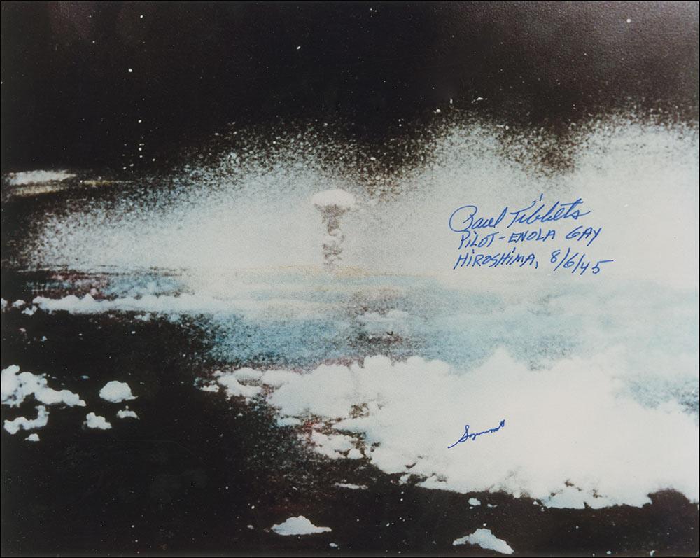 Color glossy 10 x 8 photo of the Hiroshima mushroom cloud, signed in blue felt tip, “Paul Tibbets, Pilot—Enola Gay, Hiroshima 8/6/45.” In fine condition, with a small felt tip notation near bottom.