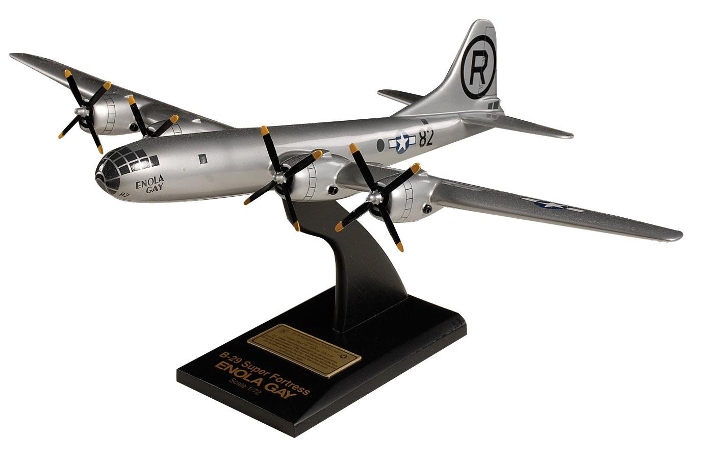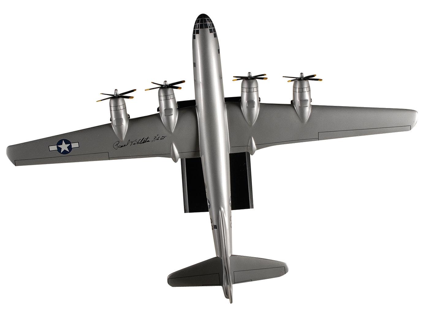 Impressive and detailed 1/72 scale model of the Enola Gay, signed on the wing in black felt tip, “Paul Tibbets, Pilot.” Comes complete with wooden display stand. In fine condition, with some minor assembly required. Accompanied by a photo taken at time of private signing.