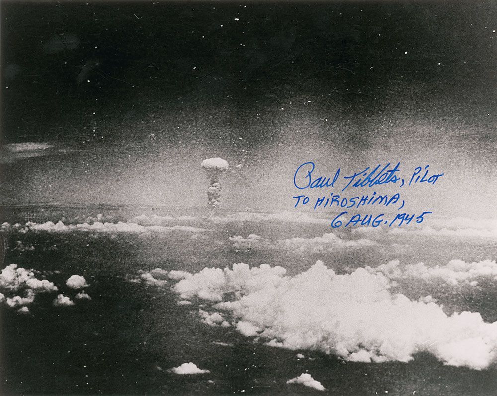 Glossy 10 x 8 photo of the Hiroshima mushroom cloud, signed in blue felt tip, “Paul Tibbets, Pilot to Hiroshima, 6 Aug. 1945.” In fine condition.