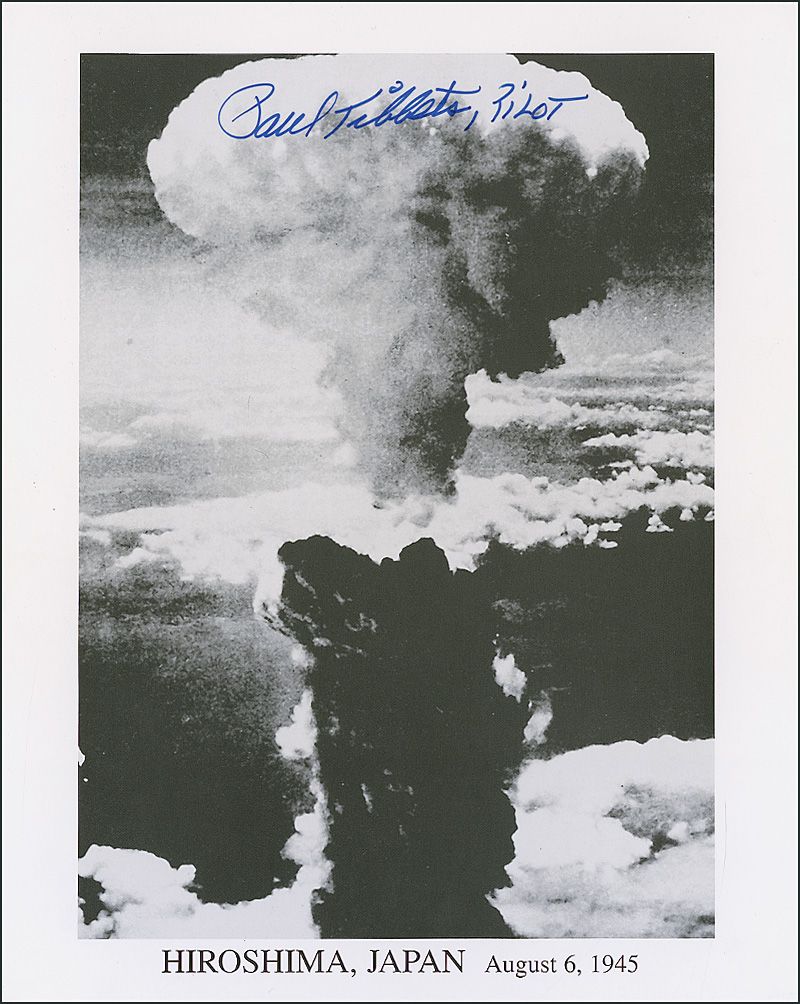 Chilling 8 x 10 cardstock photo of the Hiroshima mushroom cloud, signed in blue felt tip, “Paul Tibbets, Pilot.” In fine condition.