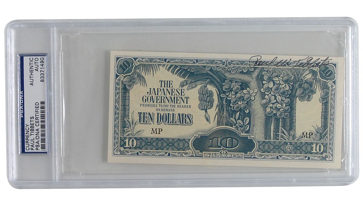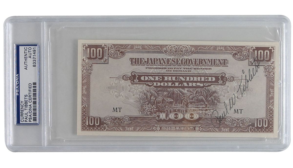 Two Japanese banknotes in 10 and 100 dollar denominations, each signed in black felt tip, “Paul W. Tibbets.” Both are encapsulated in plastic PSA/DNA authentication holders. In overall fine condition.