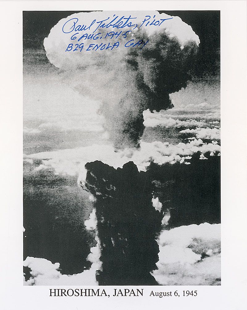 Cardstock 8 x 10 photo of the atomic explosion at Hiroshima, signed in blue felt tip, “Paul Tibbets, Pilot, 6 Aug. 1945, B29 Enola Gay.” In fine condition.
