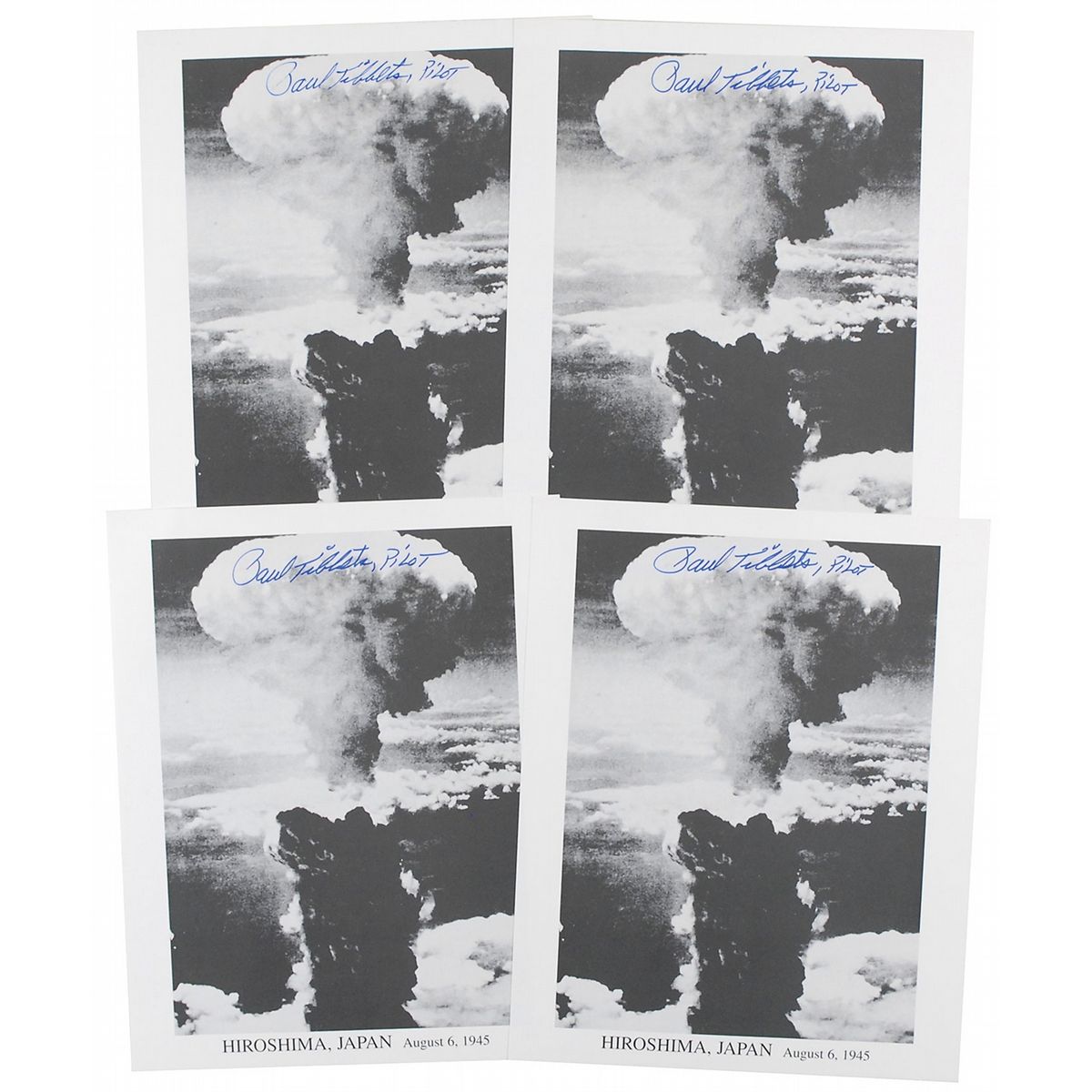 Four identical 8 x 10 cardstock photos of the mushroom cloud over Hiroshima, each neatly signed across the top in blue felt tip, “Paul Tibbets, Pilot.” In overall fine condition.