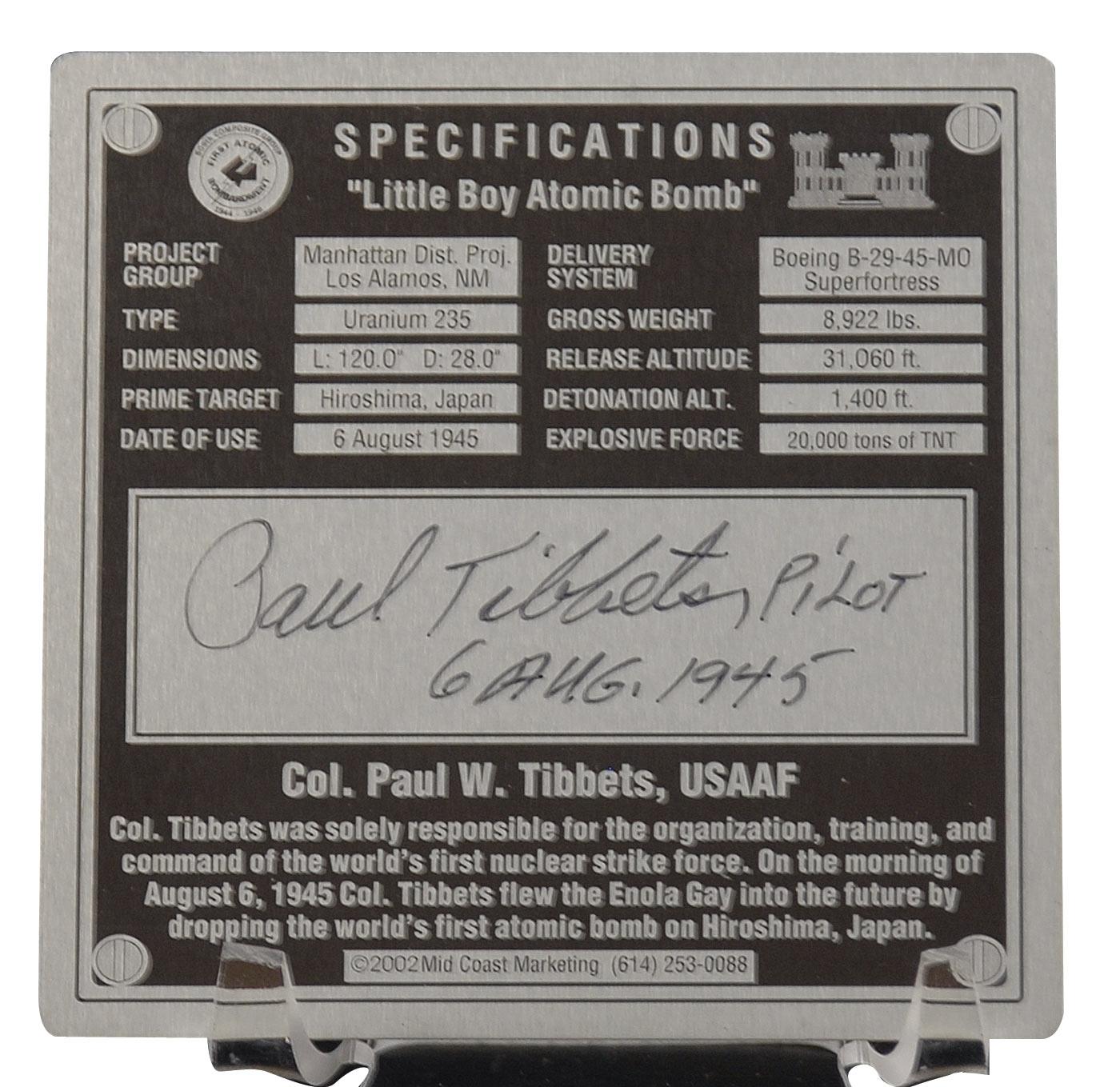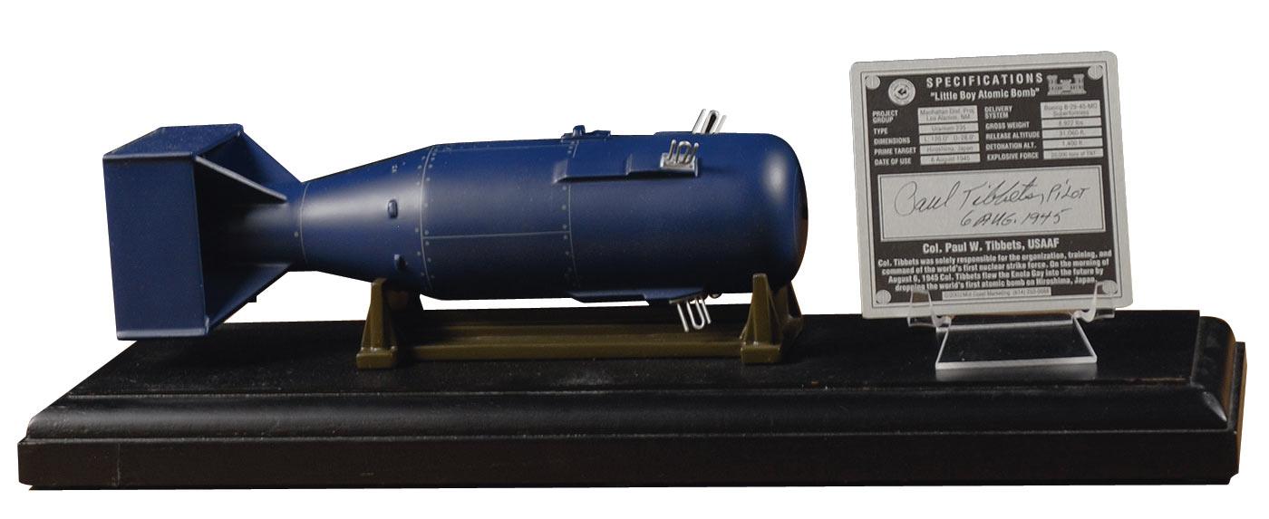 Detailed cast plastic scale model of the ‘Little Boy’ atomic bomb dropped over Hiroshima, affixed to its original painted wooden base, the bomb itself measuring approximately 10 x 3 x 2.5, signed in black felt tip on an accompanying placard detailing the bomb’s specifications, “Paul Tibbets, Pilot. 6 Aug. 1945.” Housed in its original clear plastic case. In very fine condition.