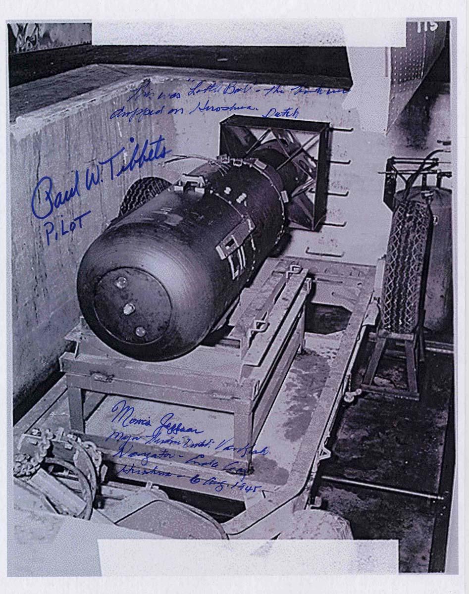 Visually impacting signed photo of ''Little Boy,'' the atomic bomb dropped on Hiroshima. 8'' x 10'' matte photo is signed ''Paul W. Tibbits / Pilot'', ''Morris Jeppson'' and ''Major Theodore 'Dutch' Van Kirk / Navigator - Enola Gay / Hiroshima - 6 Aug. 1945'' with an additional note penned by Van Kirk: ''This was 'Little Boy' - the bomb we dropped on Hiroshima. Dutch''. Image quality slightly grainy, else fine.