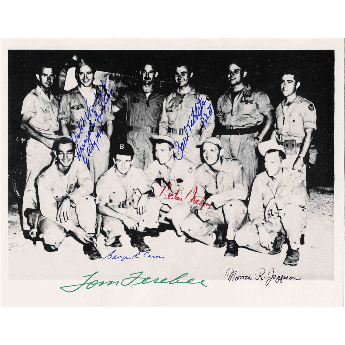 World War II Enola Gay signed photo. Eleven members of the 509th stand and kneel in two lines, in front of aircraft, in uniform. Autographs of Paul Tibbets, Rickie Nelson, George R. Caron, Tom Ferebee, Morris R. Jeppson and Dutch Van Kirk, who adds ''Enola Gay / 6 Aug 1945''. Of those who signed this photo, only Van Kirk remains living. Black and white photo measures 10'' x 8''. Signatures are bold and vary in color: black, blue, red and green inks used. Almost no creases, fine condition.