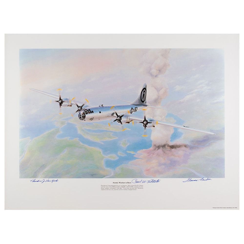 Color 24 x 18 print of a Harley Copic painting entitled ‘Atomic Warfare Is Born,’ which shows the Enola Gay flying over Japan, with a large pillar of smoke rising up from the city of Hiroshima, signed in the lower border in blue felt tip by three crew members of the Enola Gay—“Theodore J. Van Kirk,†“Paul W. Tibbets,†and “Thomas W. Ferebee.†In fine condition, with scattered light creasing.