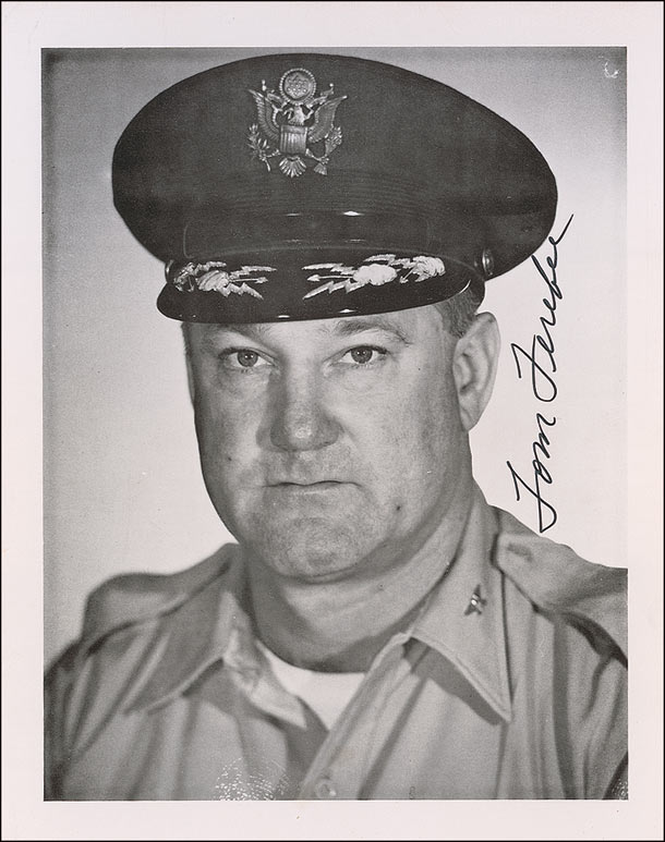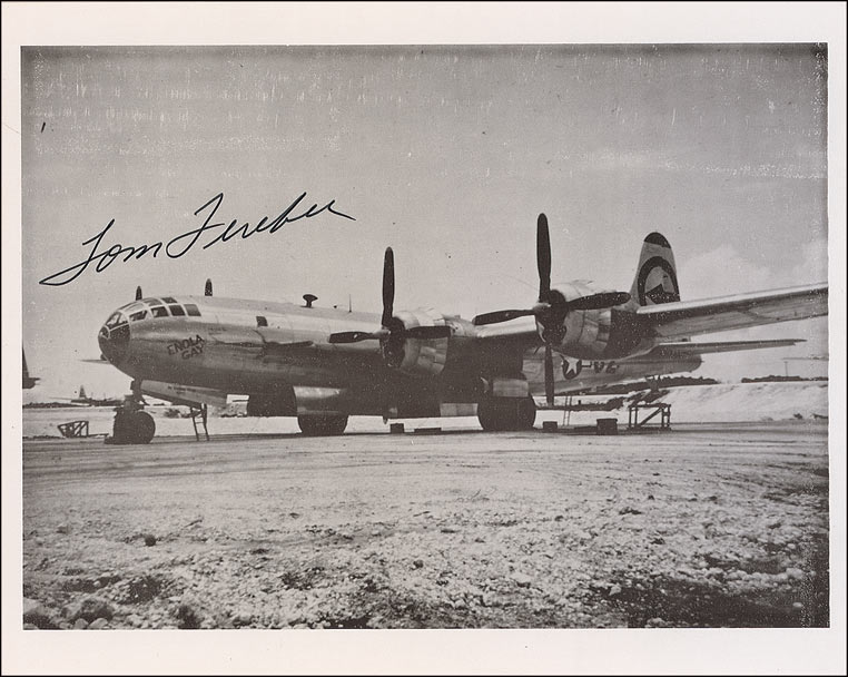 Two cardstock photos, 8 x 10 and 10 x 8, one featuring a head-shot of bombadier Thomas Ferebee, signed vertically in black felt tip, “Tom Ferebee,” and the other an image of the Enola Gay, also signed by Ferebee in black felt tip. In fine condition.