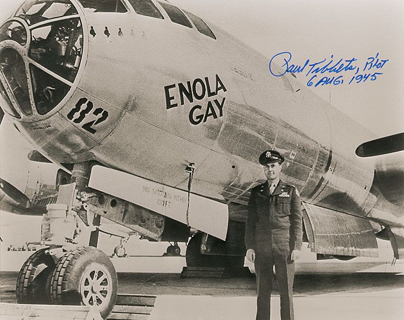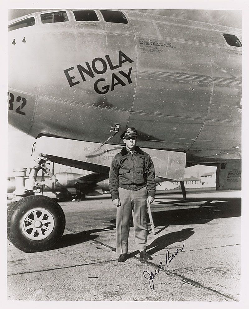 Two photos: glossy 10 x 8 photo of Tibbets in front of the Enola Gay, signed in blue felt tip, “Paul Tibbets, Pilot, 6 Aug. 1945”; and a glossy 8 x 10 photo of Jacob Beser in front of the Enola Gay, signed in black felt tip. In overall fine condition.