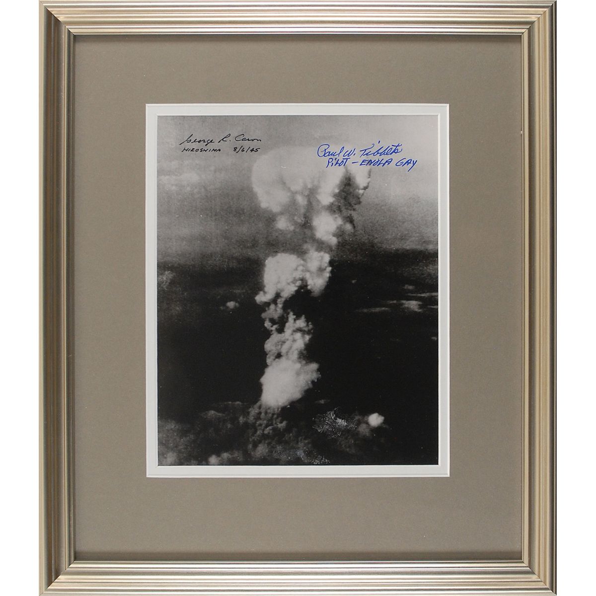 Glossy 7.75 x 9.75 photo of the atomic explosion at Hiroshima, signed in blue and black felt tip, “Paul W. Tibbets, Pilot—Enola Gay” and “George R. Caron, Hiroshima, 8/6/45.” Double-matted and framed to an overall size of 14 x 16.5. In fine condition.