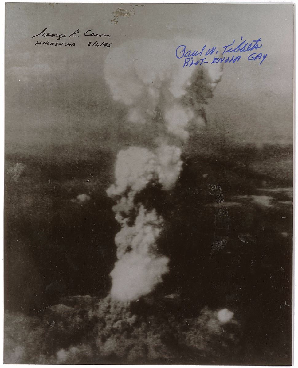 Powerful glossy 8 x 10 photo of the Hiroshima mushroom cloud, signed in black felt tip, “George R. Caron, Hiroshima, 8/6/45,” and in blue felt tip, “Paul W. Tibbets, Pilot–Enola Gay.” In fine condition, with some spotting to emulsion near top edge and trivial soiling.