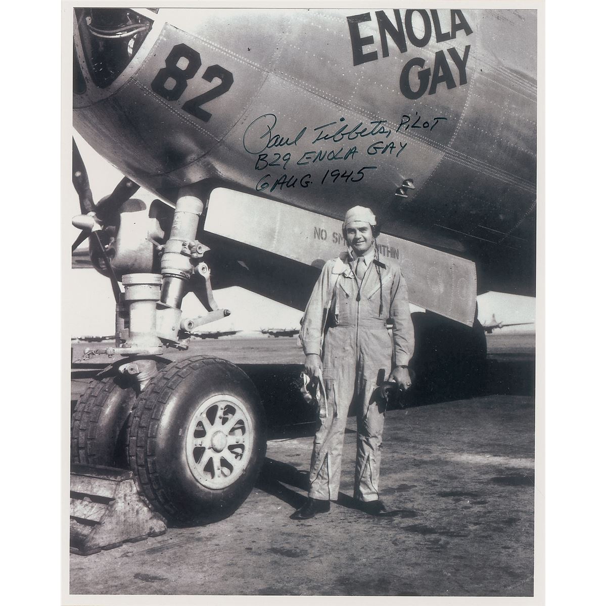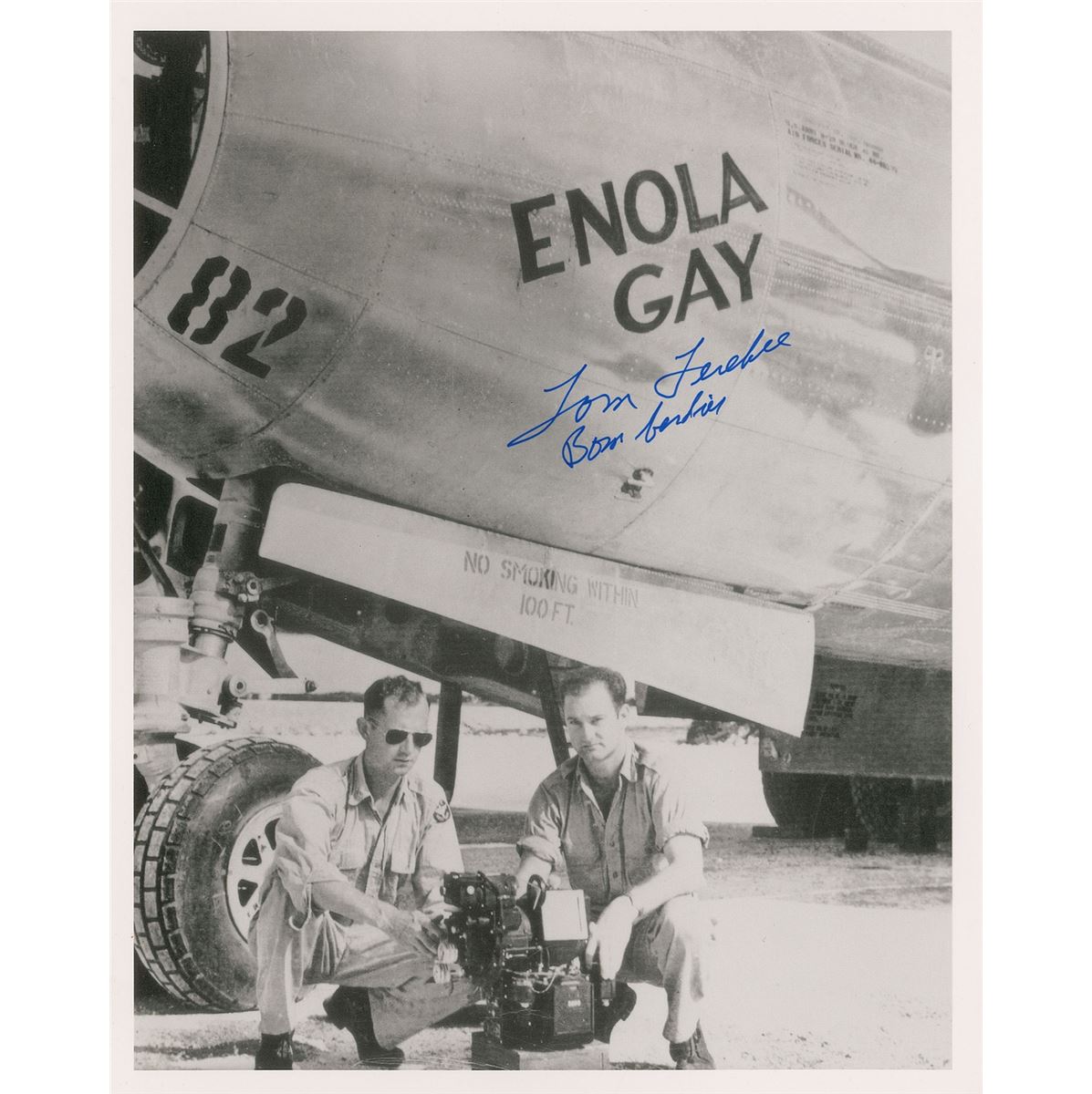 Two items: a glossy 8 x 10 photo of Tibbets posing below the front of the Enola Gay in his flight uniform, signed in black felt tip, “Paul Tibbets, Pilot, B29 Enola Gay, 6 Aug. 1945”; and an 8 x 10 cardstock photo of Ferebee and another man crouching in front of the Enola Gay, signed in blue felt tip, “Tom Ferebee, Bombardier.” In overall fine condition.