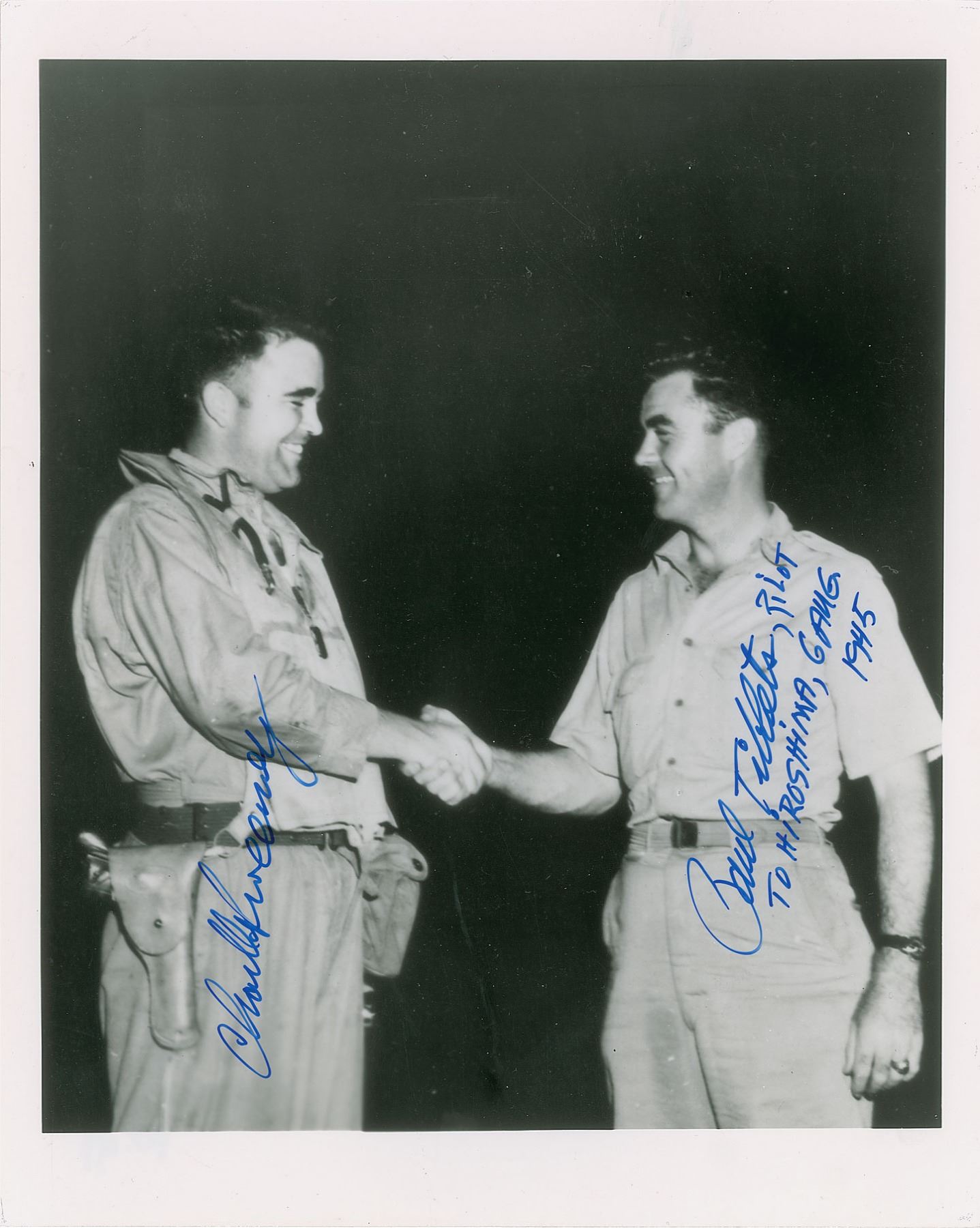 Glossy 8 x 10 photo of Enola Gay pilot Paul Tibbets and Bockscar pilot Charles Sweeney shaking hands just before Sweeney's flight to Nagasaki, signed in blue felt tip, "Paul Tibbets, Pilot to Hiroshima, 6 Aug, 1945" and "Charles W. Sweeney." In very fine condition.