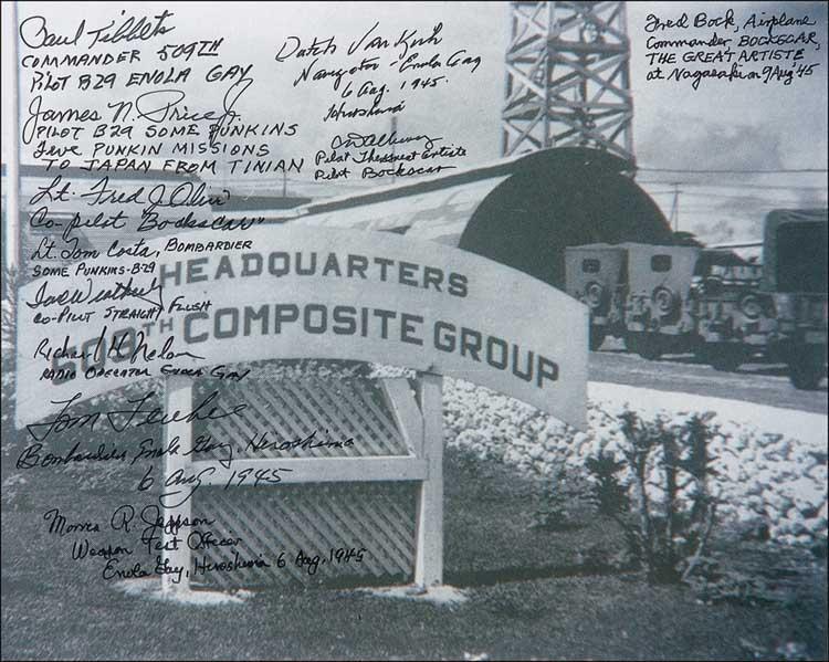 Satin-finish 10 x 8 photo of the 509th Composite Headquarters on Tinian, signed in black felt tip by 11 members of the group: Paul Tibbetts, Fred Olivi, Richard Nelson, Tom Ferebee, Morris Jepson, Dutch Van Kirk, Fred Bock, C. D. Albury, James Price, Tom Costa, and Ira Weatherly, all adding their assignments under their signatures. In very fine condition. RRAuction COA.