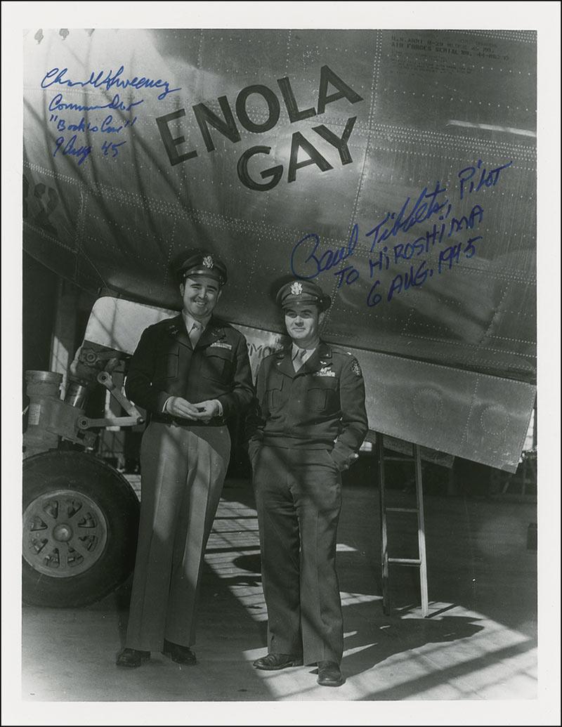 Glossy 8 x 10 photo of Paul Tibbets and Charles Sweeney standing in front of the Enola Gay, signed in blue felt tip “Paul Tibbets, Pilot To Hiroshima, 6 Aug. 1945” and “Charles Sweeney, Commander, ‘Bock’s Car’ 9 Aug 45.” In very fine condition. RRAuction COA.