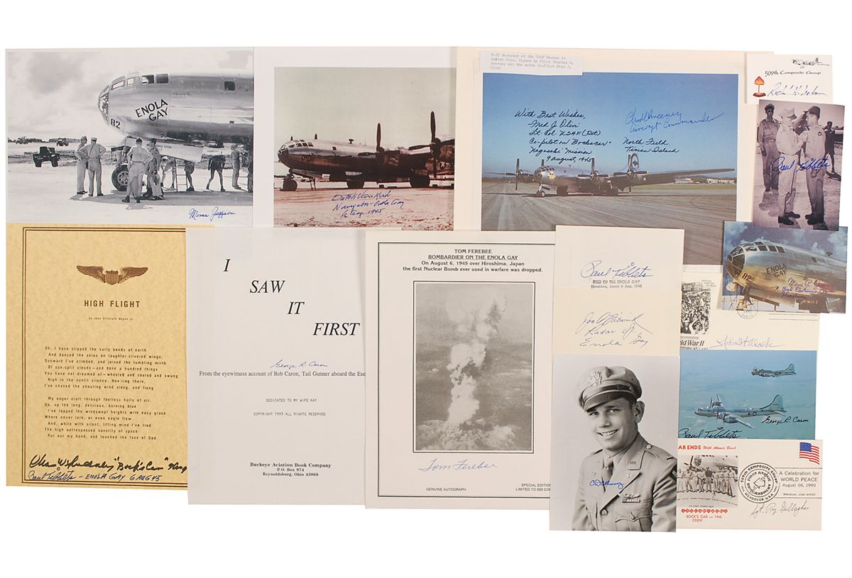 Collection of 15 items consisting of signatures, signed photos, prints, covers, and printed poems, and a souvenir typescript, each signed by a member of the Enola Gay or Bock’s Car crews, with a couple of the items signed by more than one. Signers are: Charles Sweeney (3), Fred J. Olivi, Dutch Van Kirk, Morris Jeppson (2), Paul Tibbets (4), George Caron (2), Tom Ferebee, C. D. Albury, John Kuharek, R. H. Nelson, Ray Gallagher, and Joe Stiborik. In fine condition.