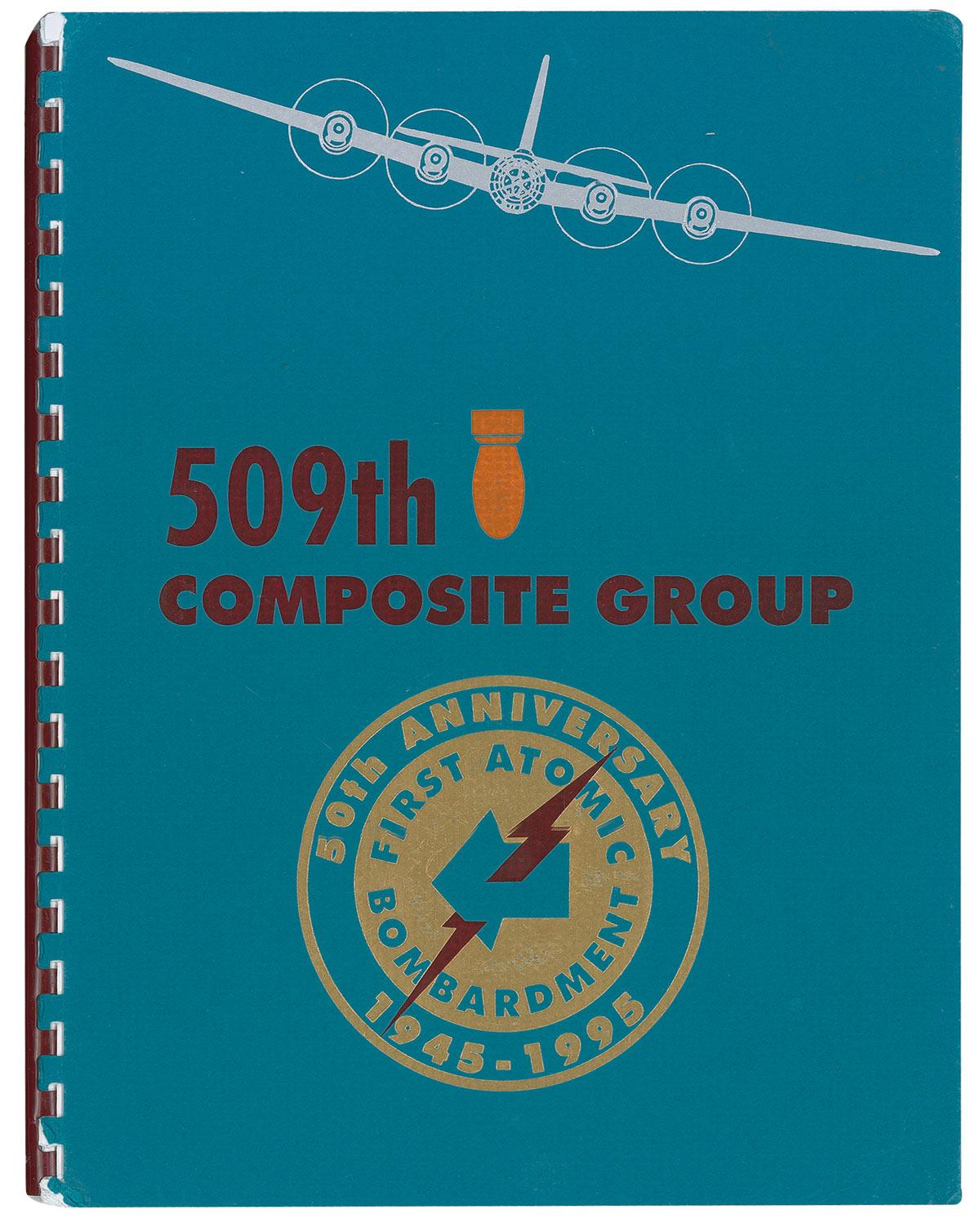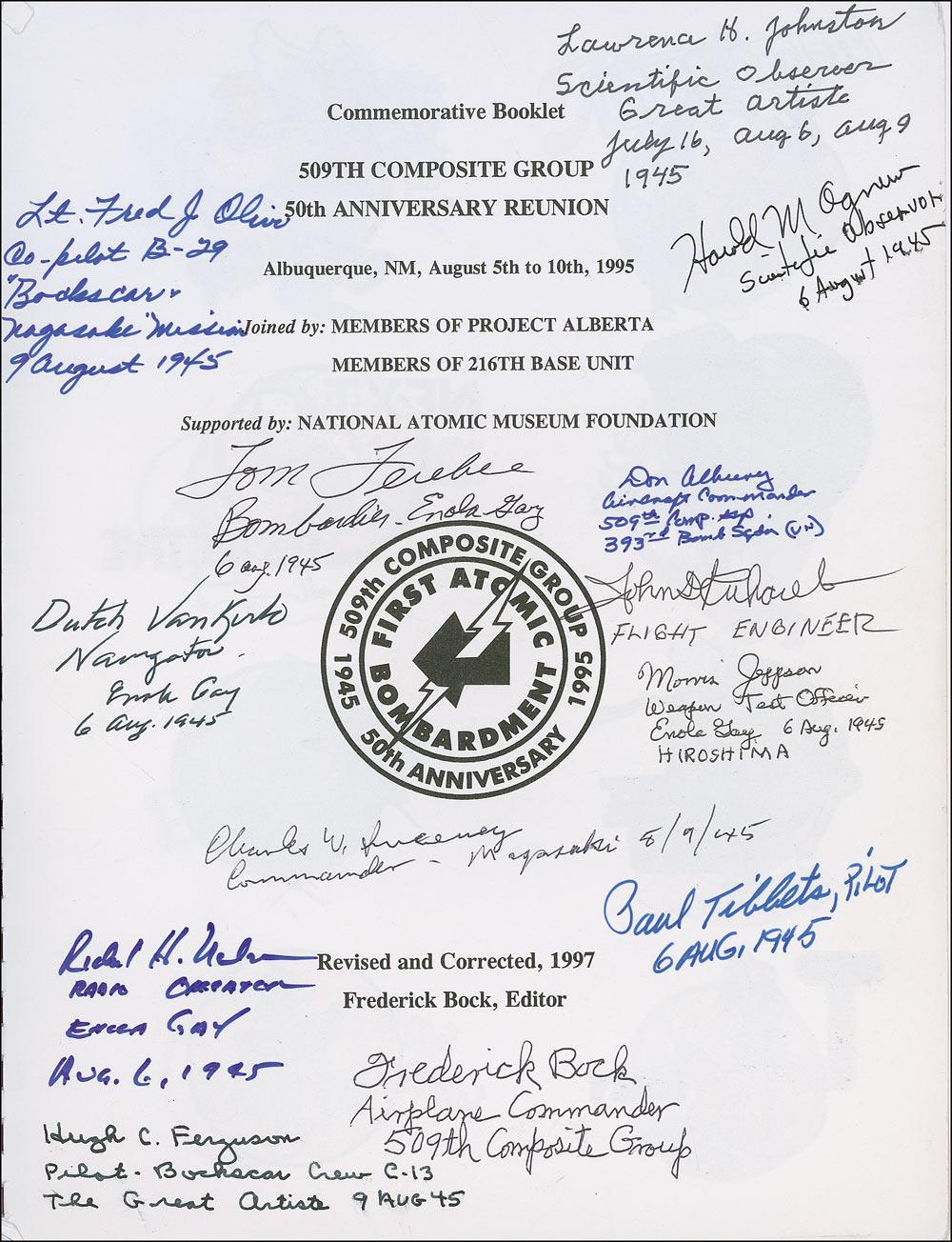 Spiral-bound program from the 50th Anniversary Reunion of the 509th Composite Group, 8.5 x 11, 128 pages, signed on the first page in ink and felt tip by 13 group members including: Paul Tibbets, Lawrence Johnston, Harold Agnew, Fred J. Olivi, Tom Ferebee, Dutch Van Kirk, Morris Jeppson, Charles Sweeney, Richard Nelson, Hugh C. Ferguson, and Frederick Bock. All have added their flight or support assignments under their signatures. In fine condition, with a couple of dings at binding to cover and first page.