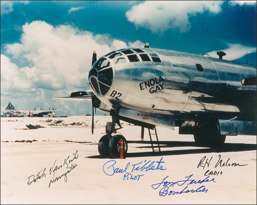 Color satin-finish 10 x 8 photo of the Enola Gay on the tarmac, signed in blue felt tip by Paul Tibbets and Tom Ferebee and in black felt tip by Dutch Van Kirk and Richard Nelson. All four have added their flight assignment under their signatures. In fine condition, with a couple minor corner creases.