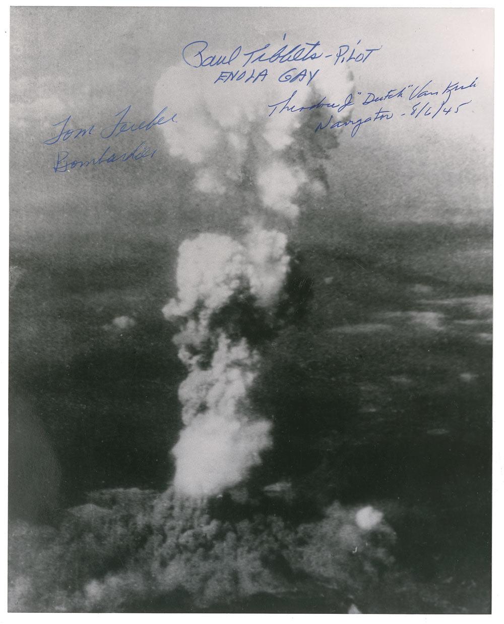Glossy 8 x 10 photo of the Hiroshima mushroom cloud, signed in blue felt tip by Paul Tibbets, Tom Ferebee, and Theodore Van Kirk, each adding their flight assignments. In fine condition, with a couple trivial surface dings.
