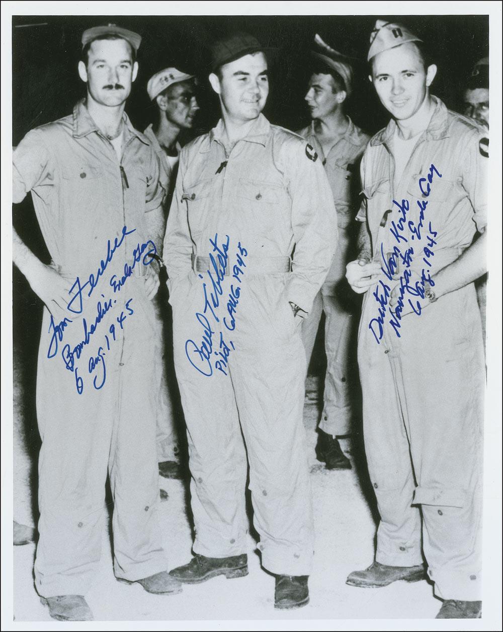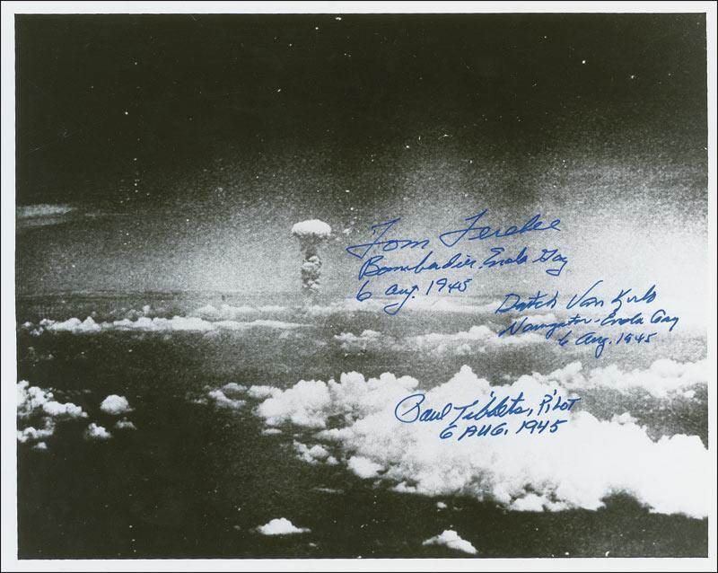 Satin-finish 10 x 8 photo of the Hiroshima mushroom cloud, signed in blue felt tip by Tom Ferebee, Paul Tibbets, and Dutch Van Kirk; and a glossy 8 x 10 photo of crew members Tibbets, Ferebee, and Van Kirk, signed vertically in blue felt tip by all three, each adding their flight assignments underneath. In fine condition.