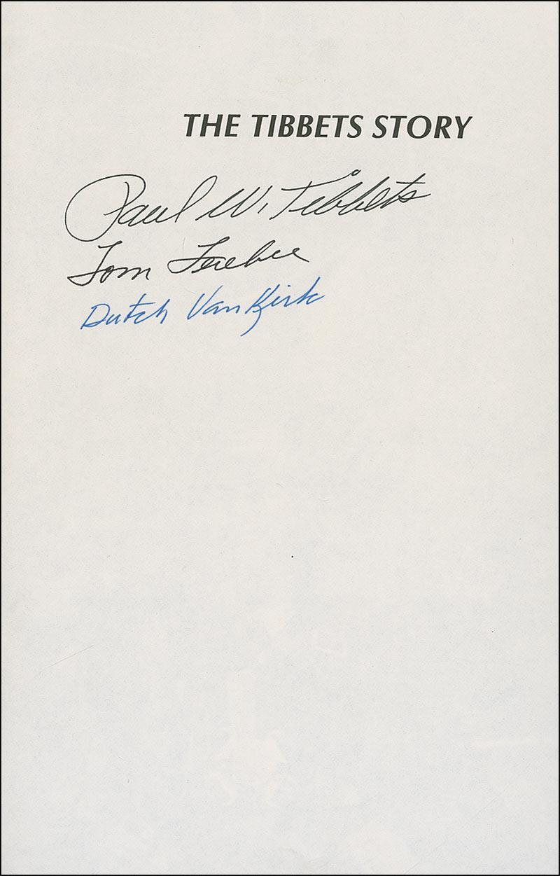 Signed book: The Tibbets Story. NY: Stein and Day, 1978. Hardcover with dustjacket, 6.5 x 9.25, 316 pages. Signed on the half-title page in blue and black ink by Paul Tibbets, Tom Ferebee, and Dutch Van Kirk. In fine condition, with a clipped dustjacket.