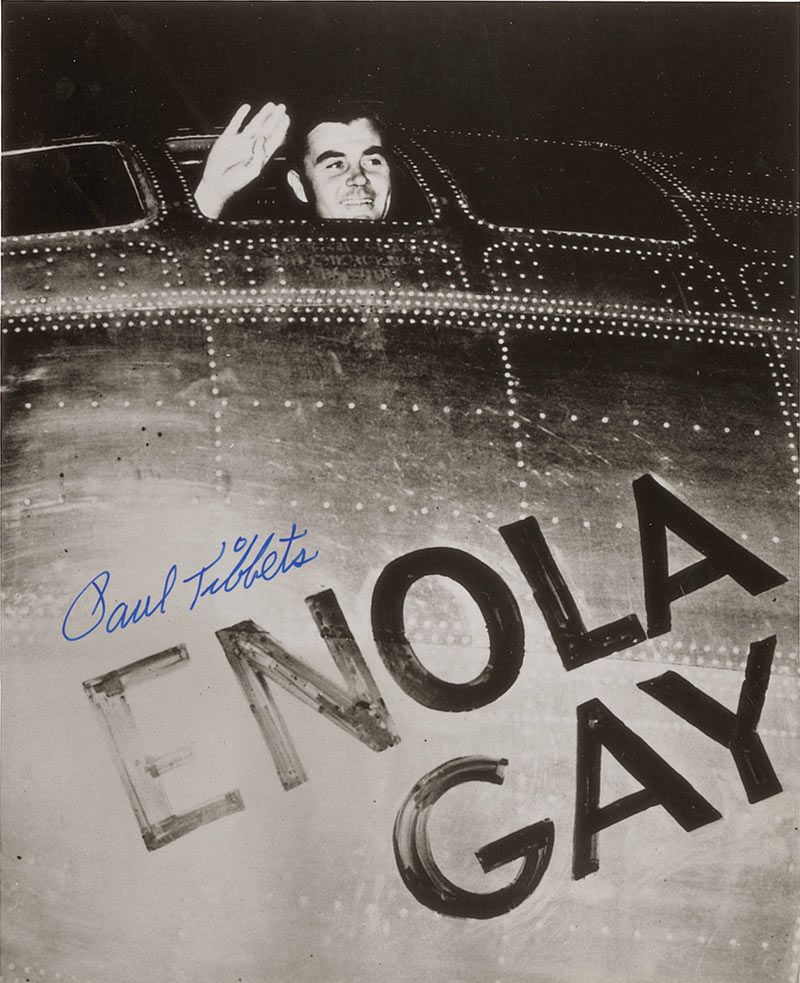 Two photos: glossy 10 x 8 photo of the Enola Gay backing over the bomb pit on Tinian, signed in blue felt tip by Paul Tibbets, Tom Ferebee, Dutch Van Kirk, Richard Nelson, and Morris Jepson, each adding their flight assignment; and a glossy 8 x 10 photo of Paul Tibbets waving from the cockpit, signed in blue felt tip. In fine condition.