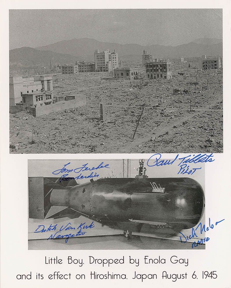 Semi-glossy 8 x 10 cardstock photo of Little Boy and its aftermath, signed in blue felt tip by Paul W. Tibbets, Tom Ferebee, Theodore ‘Dutch’ Van Kirk, and Dick Nelson, with each adding his assignment. In fine condition.