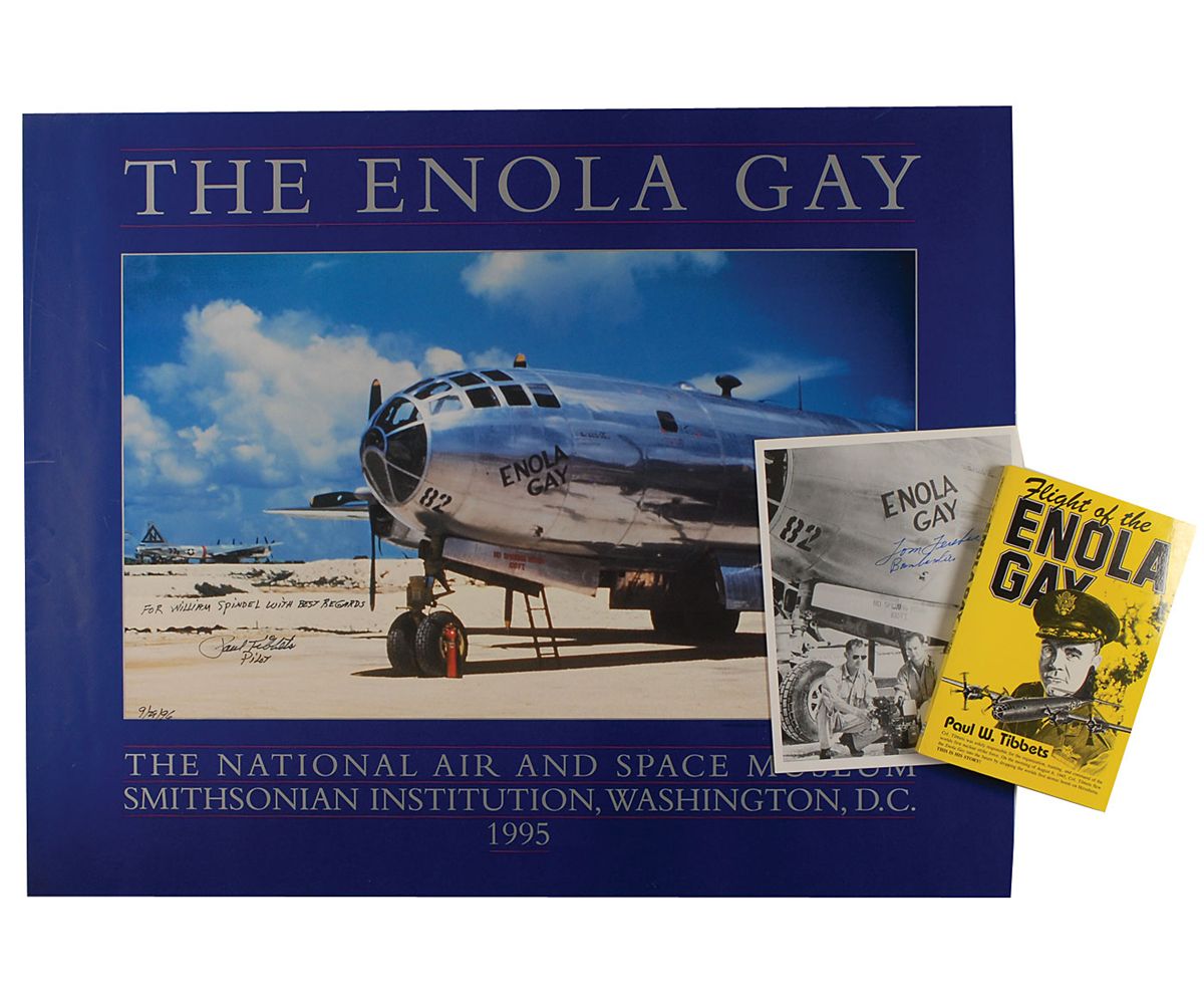 Three items: one large color 30 x 24 poster of the Enola Gay published by the Smithsonian, signed and inscribed in black felt tip by Paul Tibbetts; one 8 x 10 cardstock photo of the Enola Gay signed in blue ballpoint, “Tom Ferebee, Bombardier”; one softco