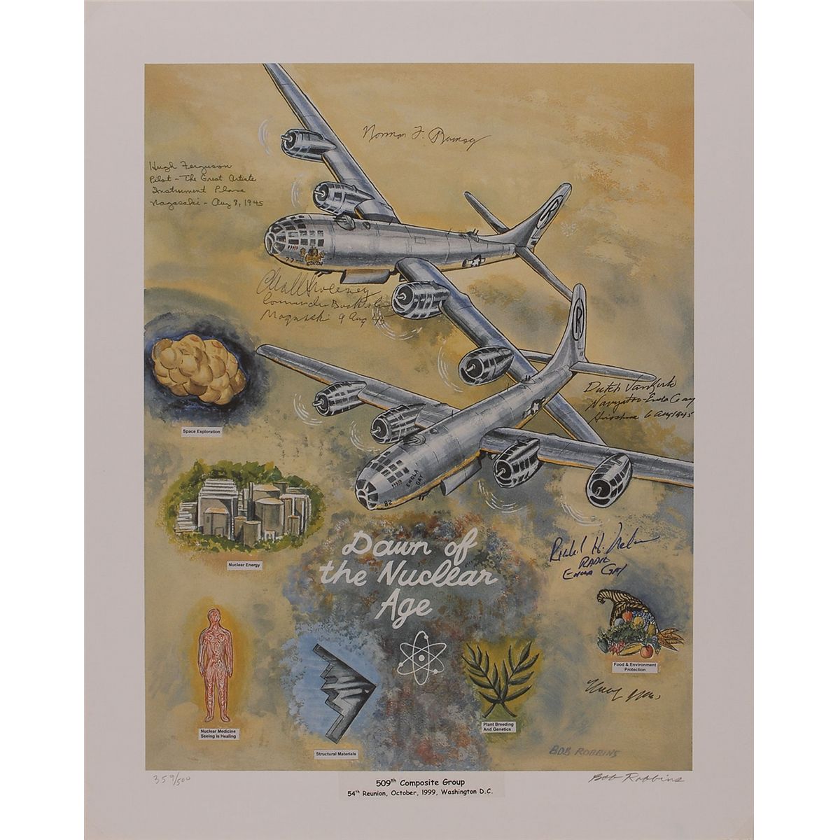 Color limited edition 16 x 20 print entitled Dawn of the Nuclear Age, numbered #359/500, signed in felt tip by six members of the 509th Composite Group at their 54th Reunion in October of 1999. Signers are: Richard H. Nelson, Dutch Van Kirk, Norman F. Ram