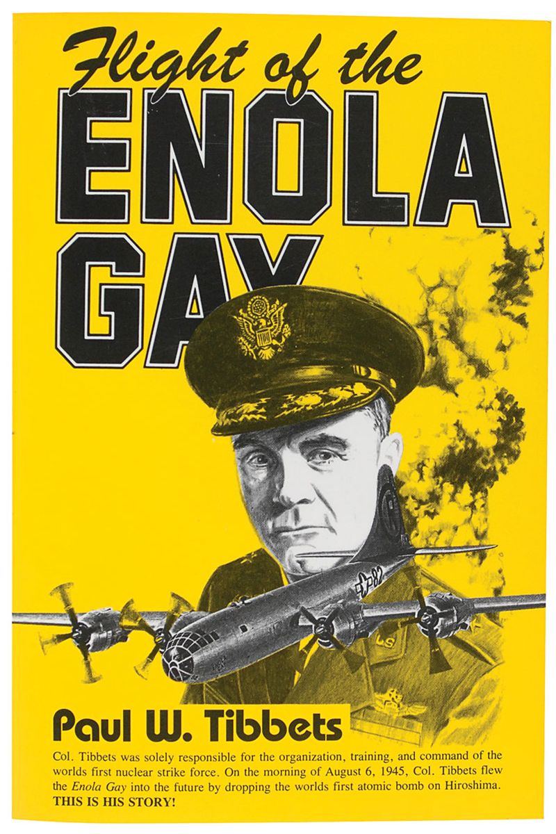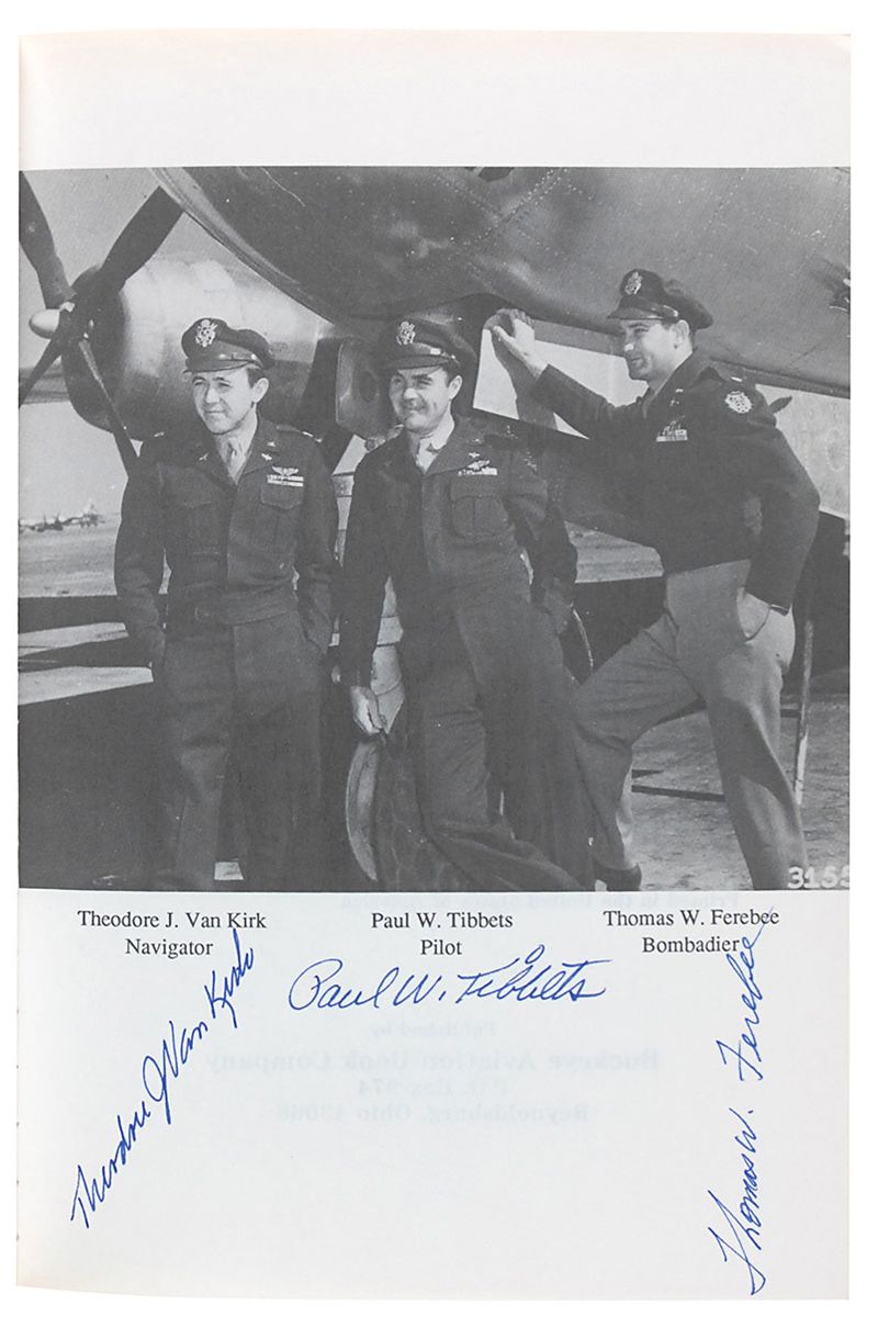 Signed book: Flight of the Enola Gay. Ohio: Buckeye Aviation, 1989. Softcover, 6 x 9, 316 pages. Signed under their images on an opening page by Paul Tibbets, Theodore Van Kirk, and Tom Ferebee. In fine condition.