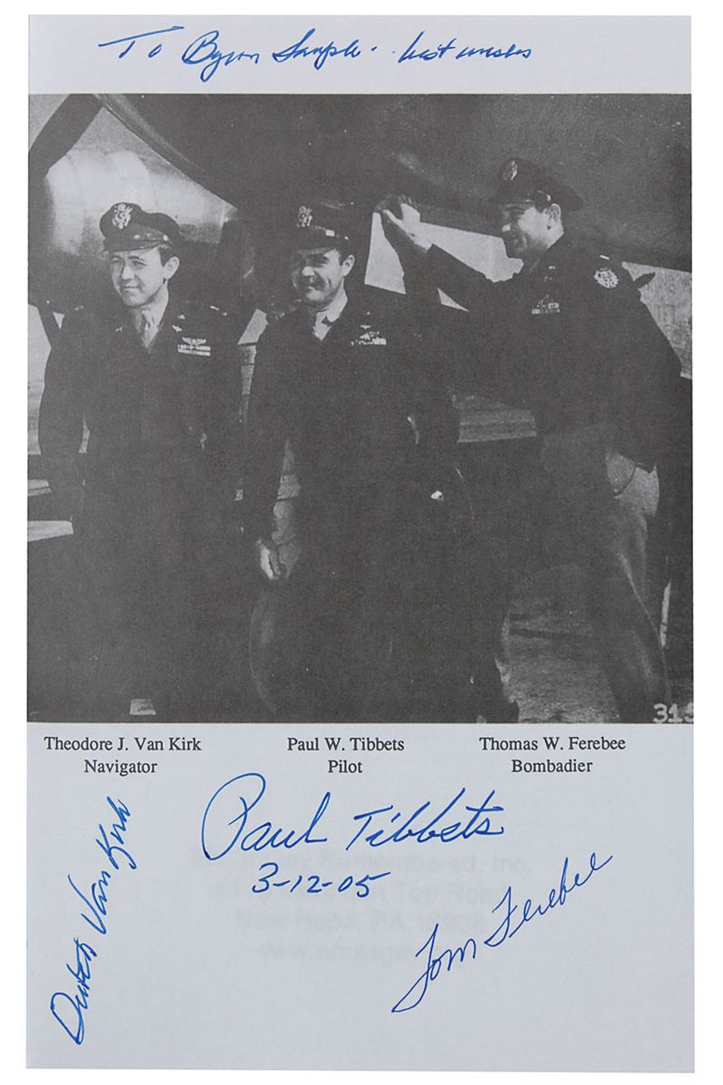 Signed book: Return of the Enola Gay. First edition. Pennsylvania: Enola Gay Remembered, Inc., 1998. Hardcover with dust jacket, 6.25 x 9.25, 339 pages. Signed on the opening page bearing a photo of the crew members by Paul Tibbets, Dutch Van Kirk, and Tom Ferebee, with an inscription by Van Kirk at the top. In fine condition.