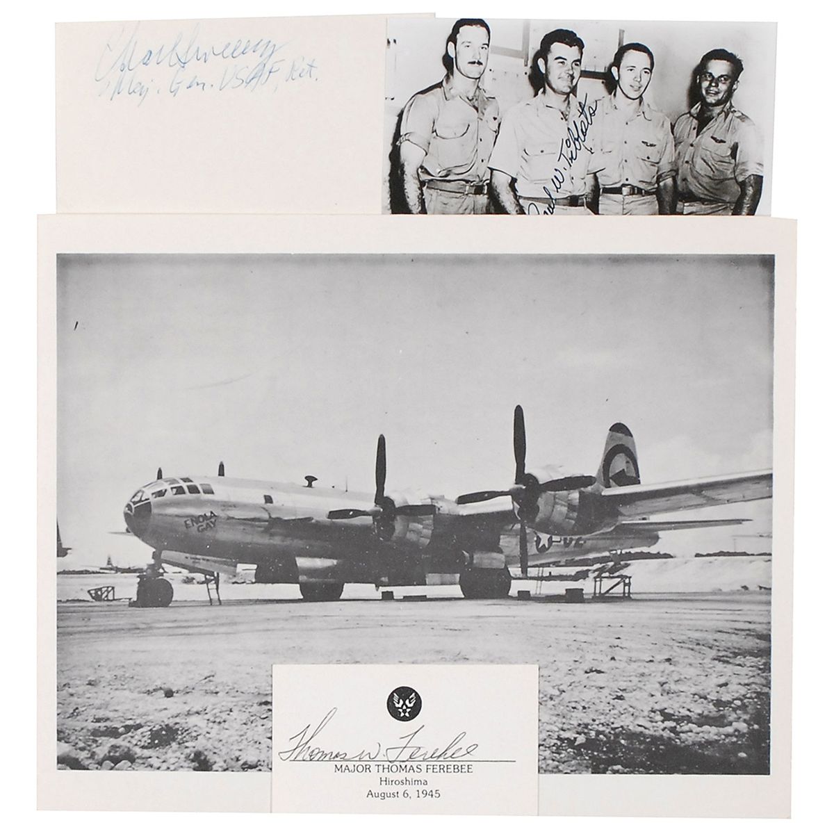 Three items: satin-finish 5 x 3.5 photo of Paul Tibbets, signed in black felt tip by Tibbets; ballpoint signature of Charles Sweeney on an off-white 5 x 3 card; and a ballpoint signature of Thomas W. Ferebee on a 3.5 x 2 card, affixed to a 10 x 8 cardstock photo. In overall fine condition.