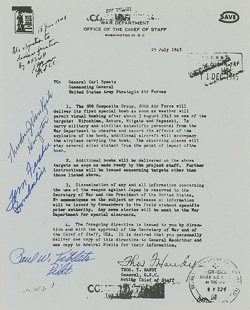 Reproduction of an official letter from General Thomas Handy, one page, 8 x 9.75, originally dated July 25, 1945, to General Carl Spears, commanding general, United States Army Strategic Air Force, announcing preparations for the dropping of the atomic bomb. Signed in blue ink and felt tip by Paul Tibbets, Tom Ferebee, and Theodore Van Kirk, all adding their flight assignments. In very fine condition.