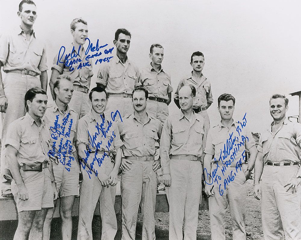 Glossy 10 x 8 photo of the Enola Gay crew when they were presented to the press, signed in blue felt tip by Paul Tibbets, Dutch Van Kirk, Morris Jeppson, and Richard Nelson, all adding their flight assignments under their signatures. In fine condition. Accompanied by a letter from 509th historian Robert Krauss, who obtained the signatures.