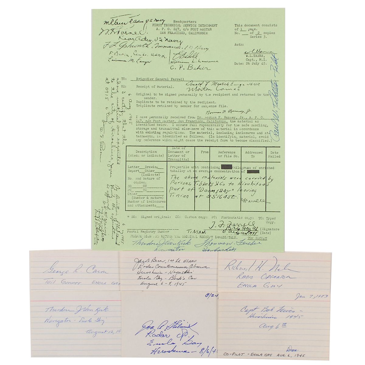 Collection of seven items consisting of ink signatures of George Caron, Richard Nelson, Theodore Van Kirk, Jacob Beser, Bob Shumard, and Joe Stiborik on individual cards; and a reproduction photocopy of a July 26, 1945, memo regarding the delivery of the bomb, signed by Paul Tibbets, Thomas Ferebee, and Theodore Van Kirk. In fine condition.