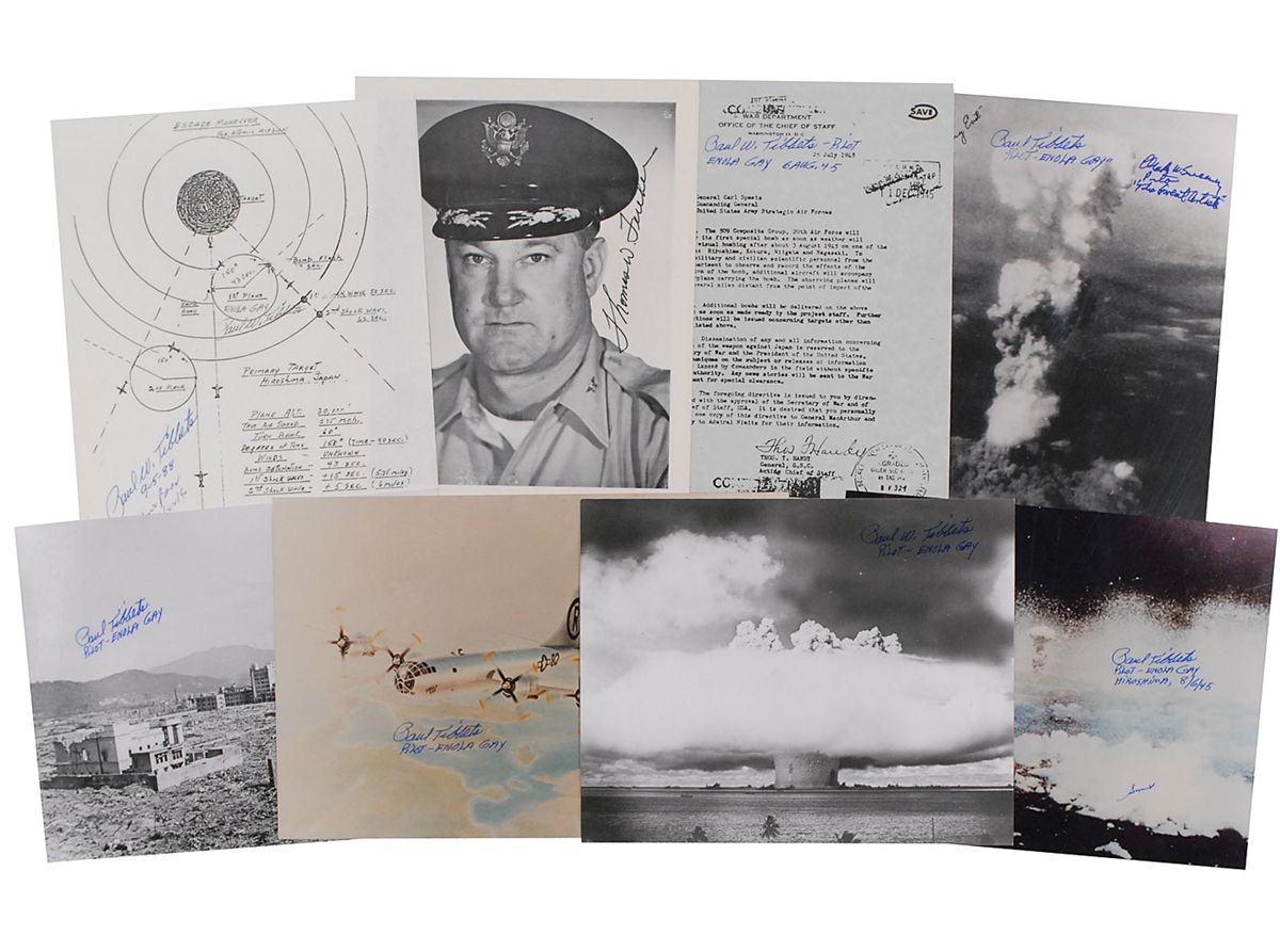Nice grouping of eight items, all approximately 8 x 10 or 10 x 8, signed by figures associated with the Enola Gay, including: Paul Tibbets, Charles W. Sweeney, and George W. Marquardt (SP); Paul Tibbets (four photos, one souvenir typescript); Paul Tibbets and Jacob Beser (souvenir typescript); and Tom Ferebee (SP). In overall fine condition.
