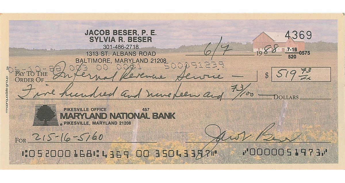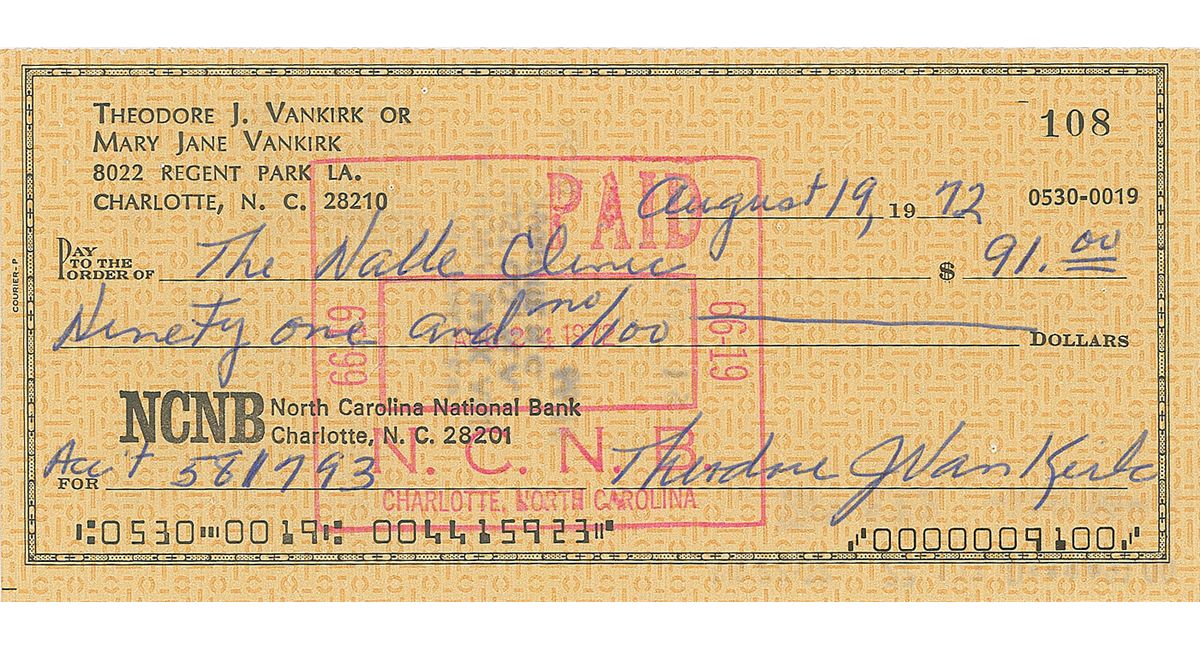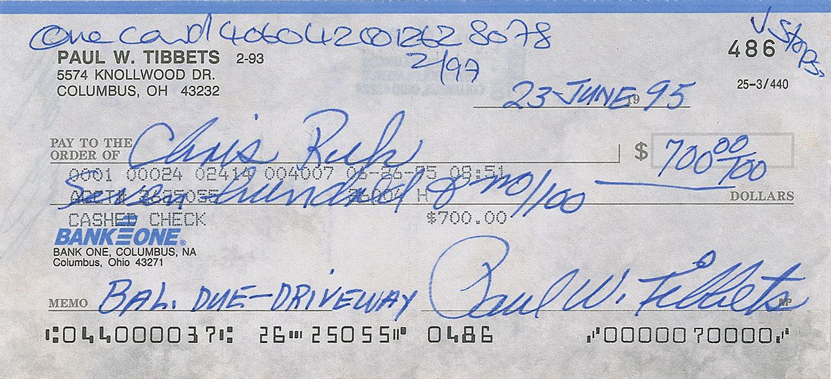 Three personal checks, each 6 x 2.75, each filled out and signed by a different Enola Gay crew member. Signers are: Paul Tibbets, Theodore ‘Dutch’ Van Kirk, and Jacob Beser. In fine condition, with expected bank stamps and folds.