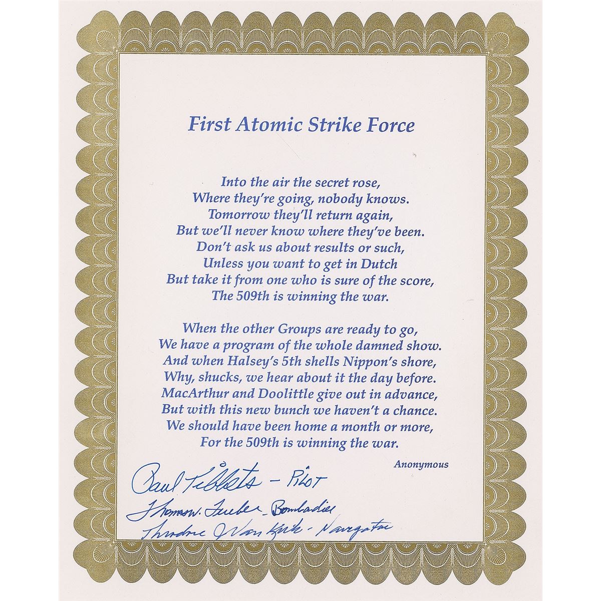 Souvenir typescript of a poem entitled ‘First Atomic Strike Force,’ one cardstock page, 8 x 10, signed at the conclusion in blue felt tip by Paul Tibbets, Theodore Van Kirk, and Thomas Ferebee, all adding their flight assignments. In fine condition.