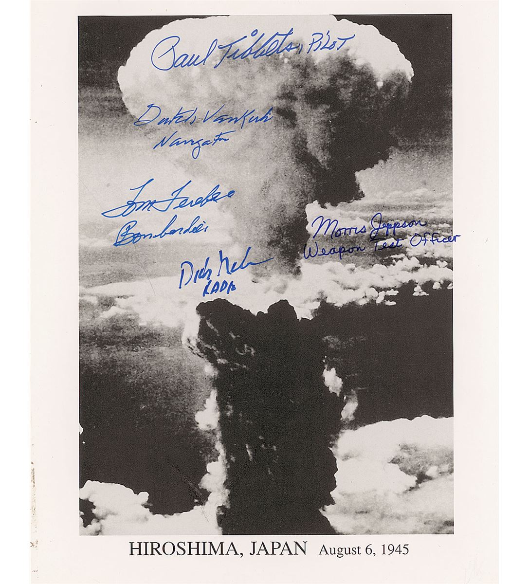 Powerful 8 x 10 cardstock photo of the mushroom cloud over Hiroshima, signed in blue ink, “Paul Tibbets, Pilot,” “Dutch Van Kirk, Navigator,” “Tom Ferebee, Bombardier,” “Dick Nelson, Radio,” and “Morris Jeppson, Weapon Test Officer.” The image is captioned along the bottom border, “Hiroshima, Japan, August 6, 1945.” In fine condition, with trivial creasing and surface impressions, and some adhesive remnants to lower left edge.
