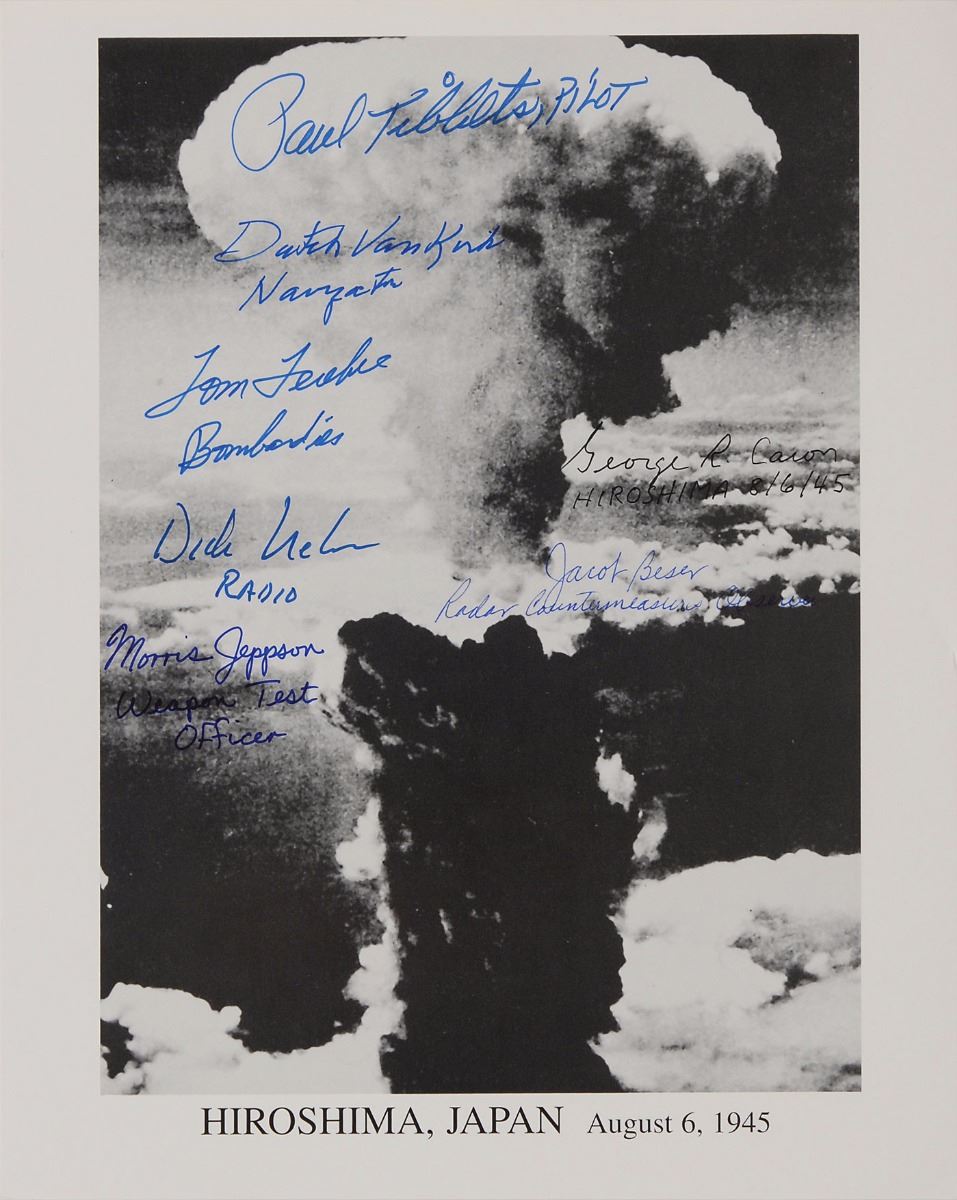 Uncommon 8 x 10 cardstock photo of the Hiroshima explosion, signed in ink by Paul Tibbetts, Dutch Van Kirk, Tom Ferebee, Dick Nelson, Morris Jeppson, George R. Caron, and Jacob Beser, all adding their flight assignments. In fine condition.