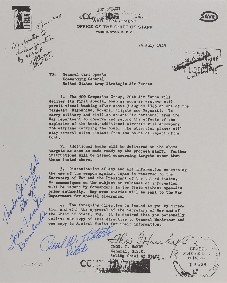 Souvenir typescript of an official letter from General Thomas Handy, one page, 8 x 9.75, originally dated July 25, 1945, addressed to General Carl Spears, commanding general of the United States Army Strategic Air Force, announcing preparations for the dropping of the atomic bomb. Signed in blue ink and felt tip by Paul Tibbets, Tom Ferebee, and Theodore Van Kirk, all adding their flight assignments. In very fine condition.