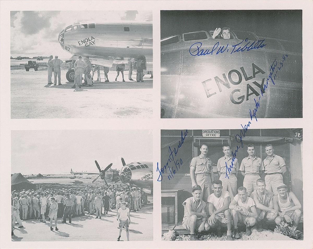 Semi-glossy 10 x 8 cardstock photo showing four images of the Enola Gay and its crew, signed in blue ink, "Paul W. Tibbets," "Tom Ferebee, 11/6/90," and "Theodore J. Van Kirk—Navigator, 11-23-90." In fine condition.