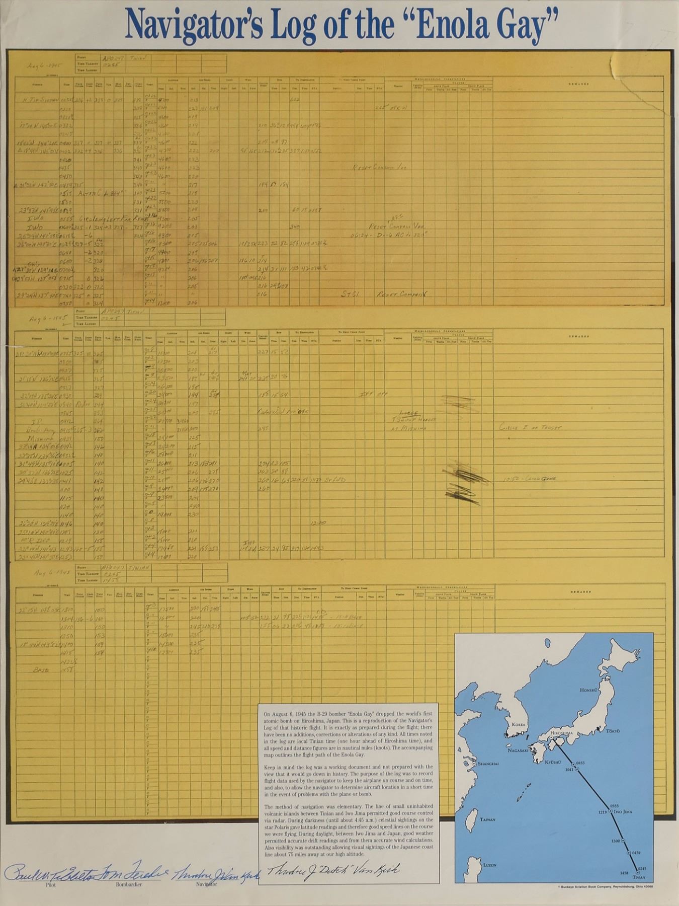 Color 18 x 24 poster reproducing the navigator's log of the Enola Gay from its historic flight on August 6, 1945, signed in the lower left in blue felt tip by Paul W. Tibbets, Tom Ferebee, and Dutch Van Kirk. Removably encapsulated in a mylar sleeve. In very good to fine condition, with scattered light creasing and a tear to the upper right corner.